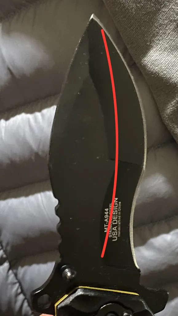 ضخامت تیغه در ابتدا خوبه ولی وقتی به وسطای کار میرسه(از قسمتی که یه طراحی هندسی شده) ضخامت به شدت کاهش پیدا میکنه و بدتر از اون یک حالت مقعر داره که متاسفانه باعث میشه در تیز کاری های بعدی ظاهر چاقو بد بشه(اون قسمت طرح هندسی رنگش میره) یا اگر بخوایم ظاهر حفظ بشه نمیشه با زاویه قبلی تیز کرد(زاویه بین ۲۰ تا ۳۰درجه) ، شاید منظورم گنگ باشه ولی داخل عکس سعی کردم مشخص کنم. بیشتر به دید کار تزئینی (مثلا قشنگی)یا کار های ساده بهش نگاه کنید
