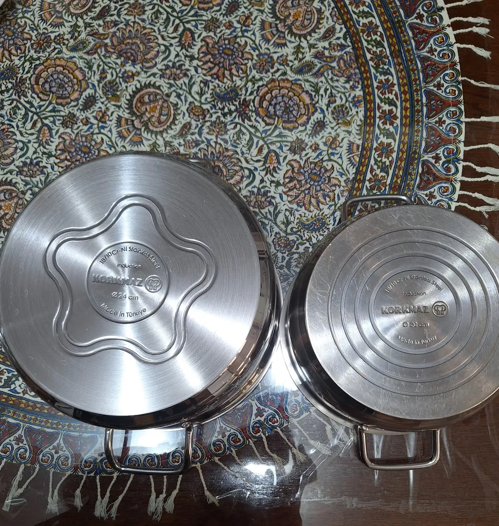 - ⬤ سرویس قابلمه 10 پارچه کرکماز : این سرویس با طراحی مدرن و زیبا، از آلیاژهای با کیفیت استیل ضد زنگ و آلومینیوم ساخته شده که موجب افزایش دوام و طول عمر آن میشود. نظرات خریداران نشان میدهد که قابلیت توزیع یکنواخت حرارت از ویژگیهای بارز این قابلمههاست، که به پخت یکنواخت غذاها کمک میکند. همچنین، سطح داخلی نچسب این سرویس، استفاده از روغن را کاهش داده و تمیز کردن آن را آسانتر میکند. وجود پارچهای متنوع با اندازههای مختلف، گزینههای مختلفی را برای آمادهسازی غذاها فراهم میکند. برخی خریداران به وزن نسبتا سنگین قابلمهها اشاره کردهاند که ممکن است برای برخی افراد مشکلساز باشد. همچنین، تعدادی از کاربران از عدم مقاومت در برابر خراشهای شدید ابراز نگرانی کردهاند. به طور کلی، نظرات خریداران نشان میدهد که این سرویس قابلمه یک گزینه عالی برای علاقهمندان به آشپزی است که به دنبال ترکیبی از کیفیت، زیبایی و عملکرد در آشپزخانه خود هستند، هرچند که باید نکات مربوط به وزن و خراشیدگی را مدنظر قرار دهند.