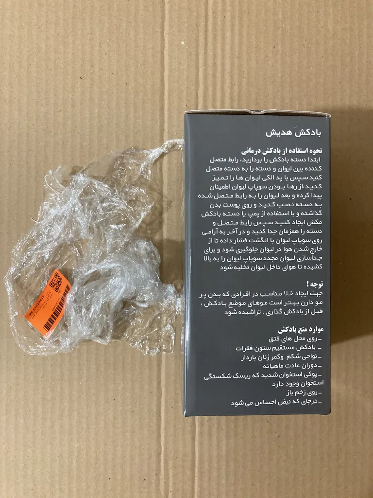 مصطفی امینی : بادکش ؛ من این بادکش به قیمت 47 هزار خریداری کردم که بجاش بادکش asn که قیمتش 26 هزار تومن بود رو فرستادن یه تیکه پلاستیک بازیافتی که یه کاپش سوراخه باچسب چسبوندن خرید از هانا ایرانیان