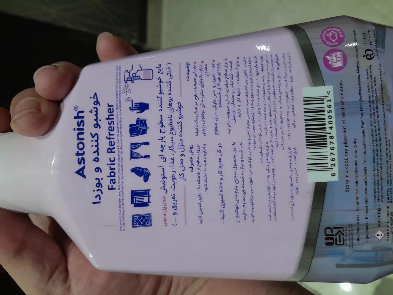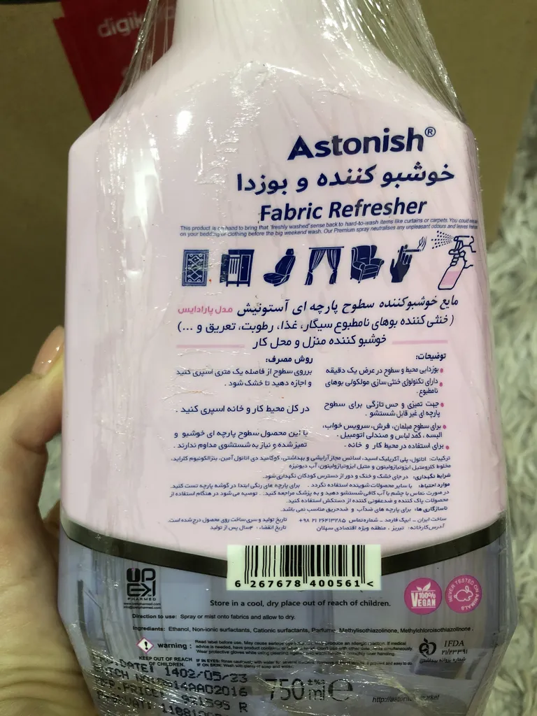 توجه من از این اسپری خشبو کننده تو اتاق در دستشویی و روی پرده استفاده می کردم یه یخچال کوچک داشتم تو اتاق خواب که بوی ترشی گرفته بو ازش اسپری کردم و گذاشتم 24 ساعت موند بعد داخل یخچال با چندین دستمال نم دار کشیدم که آثار مواد اسپری بره. بعدش قسمت های جدا شدنی پلاستیک فشرده شفاف مثل طبقات و قسمت میوه ها و.... جدا کردم با آب خالی شستم و دستمال کشیدم. [ اینجا توجه کنید]. نمیدونم چه ماده ایی در این اسپری هست که با آب واکنش نشون داد و سریع تمام این قسمت ها رو کدر کرد بسیار برام عجیبه چطور چنین چیزی ممکنه. و چه خطری میتونه این ماده داشته باشه برا سلامتی با این حجم واکنش سریع با پلاستیک فشرده قسمت های شفاف یخچال. و باید به چه سازمانی خبر داد که پیگیری کنن. ولی فعلا نظرم رو ثبت کردم و عکساشو هم میزارم البته واکنشی در مواد دیگه باهاش ندیدم