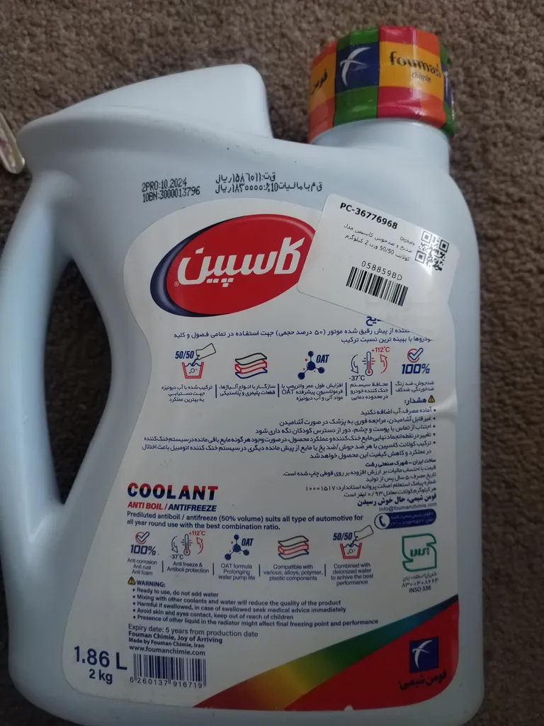 تاریخ تولید ش 03 2025 نوشته، قیمت 391400 نوشته، نوشته بدون آب استفاده شود، حتما رادیات رو از آب قبلی خالی کنید و داخلش آب فشار قوی بگیرید، تاثیر و تفاوت چشمگیری در خنک کاری کولر ساینا بعد استفاده ش حس نکردم، شاید به محافظت آلیاژ موتور و واتر پمپ کمک کنه، هر چی هست به نظرم از آب رادیات های رنگ اضافه شده بازار بهتره! تاثیرش روی موتور پژو رو نمیدونم، امیدوارم موثر باشه و به استهلاک کمتر موتور کمک کنه