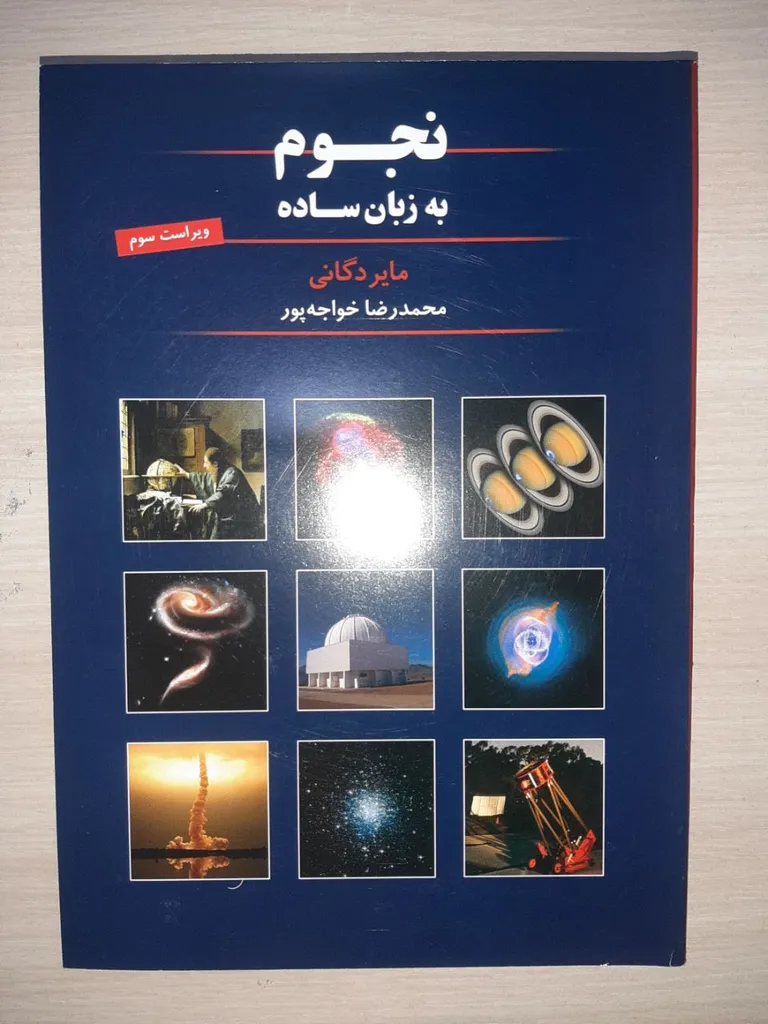 کتاب نجوم به زبان ساده اثر مایردگانی، نشر گیتاشناسی ؛ خود کتاب بسیار عالیه، پیشنهاد می کنم اگر می خواهید علم نجوم را به صورت تخصصی دنبال کنید این کتاب را برای شروع بخوانید، علاوه بر مفاهیم گسترده علم نجوم مثل تولد، تحول و مرگ و حرکات و... ستارگان و سیارات و ستارگان نوترونی، کوازار هاو کهکشان ها و دیگر اجرام آسمانی، تا حدی مفاهیم ریاضیات و فیزیک مورد نیاز برای نجوم را آورده خود کتاب هیچ مشکلی ندارد فقط وقتی کتاب بدستم رسید داخل پاکت مخصوص بود اما یکم کاغذ جلدش از هم جدا شده بود و یکم خوردگی داشت و خیلی کم از صفحات کتاب هم چاپش کمرنگ شده بود. در کل عالیه
