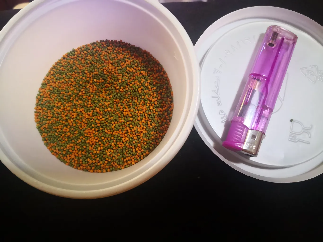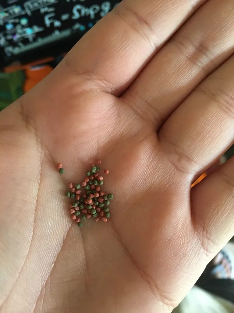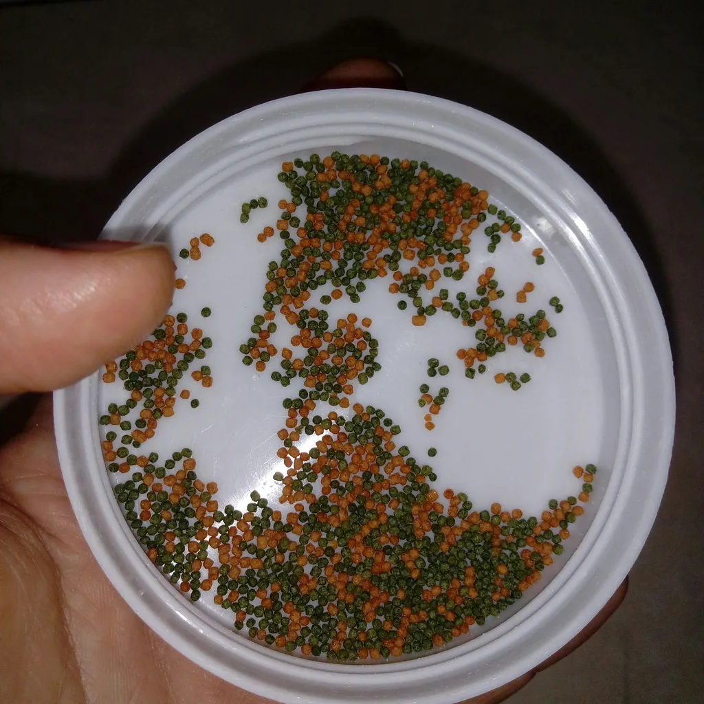 خیلی بزرگتر از اونیه که فکرشو میکردم😆. بوی تن ماهی میده بوی یونجه هم میده. من از همین دونه داشتم اون رنگ قرمز هم داشت. ولی این فقط زرد و سبزه. این تقریبا برای یه سالشون کافیه