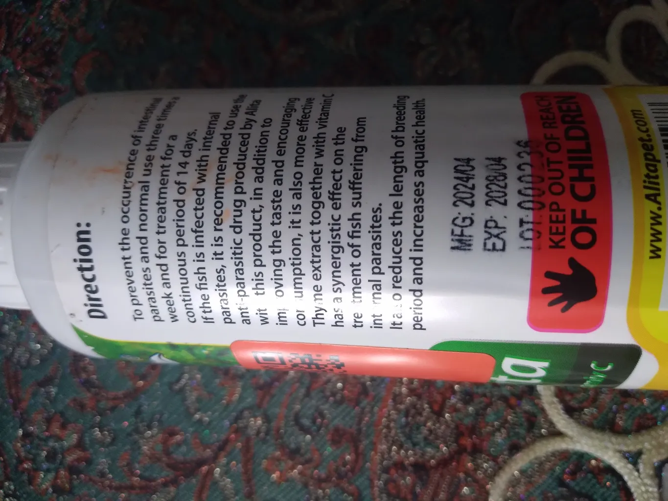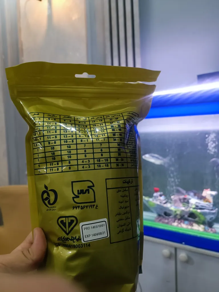 توجه بسه این غذا بصورت گرانولی هست و بدرد ماهی های ریز نمی خوره و برای ماهی های با اندازه ۱۵ سانتی متر و بزرگ تر و از نوع اهی های گیاه خوار و یا همه چیز خوار باید استفاده شود البته من با یک غذای دیگه و بصورت میکس استفاده میکنم و در ماه دو نوبت قطره مولتی ویتامین هم استفاده میکنم و حدود یک سال هم مدت زمان مصرف داره البته باید یاد آور شوم این بسته بندی ها و تاریخها استاندارد و کارخانه ای نیستند و مشخص هست کیسه ها بصورت دستی پر شده و لیبل تاریخ زده شده ولی در کل غذا های خشک ماندگاری خوبی دارند البته بشرط اینکه در جای خنک و خشک نگهداری شوند