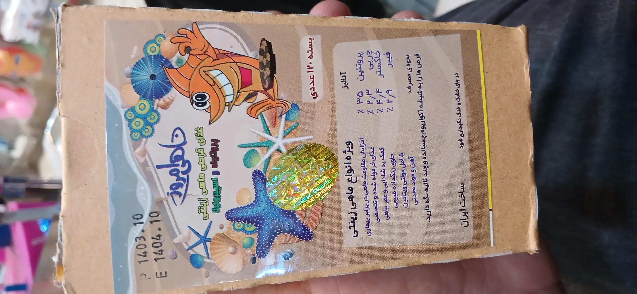 مریم فراهانی : ویرایش نظر ؛ 107 تا قرص بود که 5 تاش شکسته بود بقیه سالم بودن و راحت به شیشه میچسبه و ماهیا استقبال کردن امیدوارم ارزش غذاییش هم بالا باشه، تاریخ روز داره وقتی من خریدم ماه قبلش تولید شده بود و همچنین بسته بندی خوبی داره، فقط من دوتا قرص گذاشتم که برای ماهیای من زیاد بود و دیر تموم شد و آب رو کمی کدر کرد