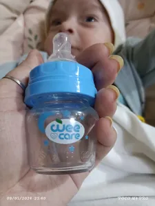 • شیشه نقلی پیرکس ؛ شیشه شیر کوچیک و پیرکسی هست چون پسرم نارسه تازه از سرنگی شیر دادن دارم به شیشه عادت میدم،این شیشه شیر مناسبه. اما بجای آبی کاربنی ، آبی برام فرستادن