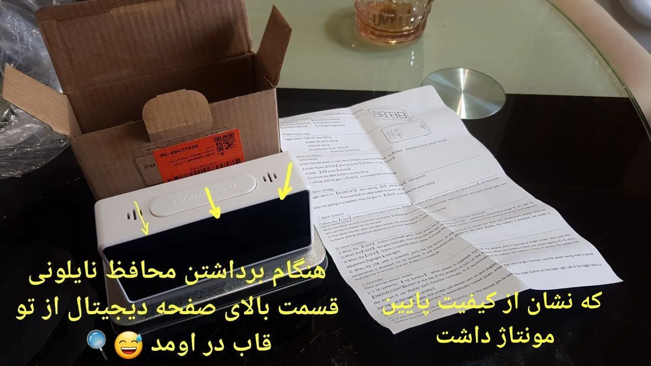 ارزیابی ساعت دیجیتال ؛ این ساعت مانند ماشین های تولید داخل شانسی است و بعد خرید ممکنه نیاز باشه یه سری کارهای تکمیلی خودتون روش انجام بدین ، برای مثال من وقت برداشتن روکش نایلونی صفحه دیجیتال ساعت دیدم خود صفحه از قسمت بالا داره در میاد و به قاب متصل نیست ، واقعا خنده دار بود ، مرجوع نکردم چون این اشکال احتمالا تو خیلی از تولیدات مشابه هم باشه و خودم با دست جا زدم تو قاب🧐🤫🥴 ، نکته دوم اینکه پدهای لاستیکی زیر ساعت طوری نصب شده که شیب به جلو داده و اگه بخواین درستش کنید خودتون زیرش یه چیزی بچسبونید شیب رو تنظیم کنید 😅 خلاصه اینکه آب بندی اون کار خود شماست