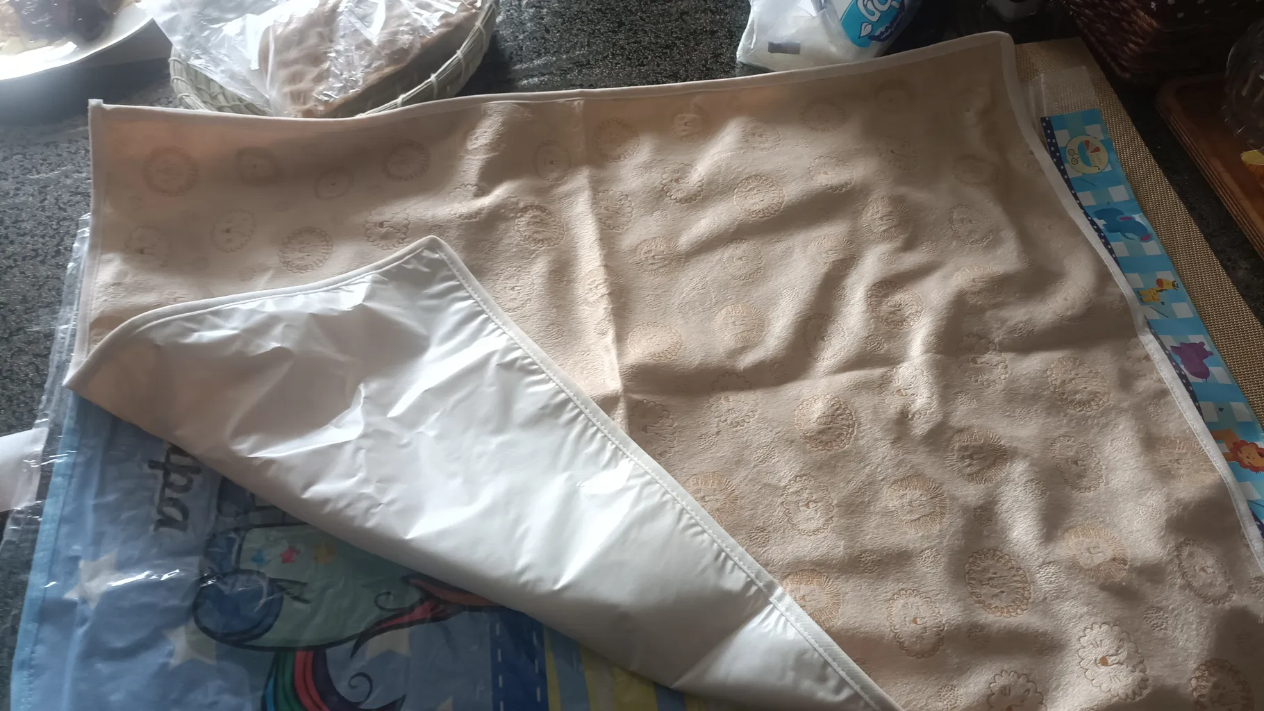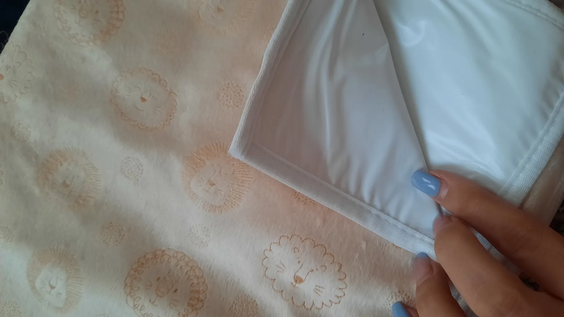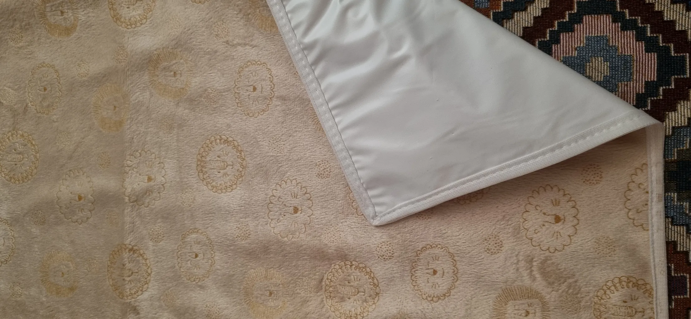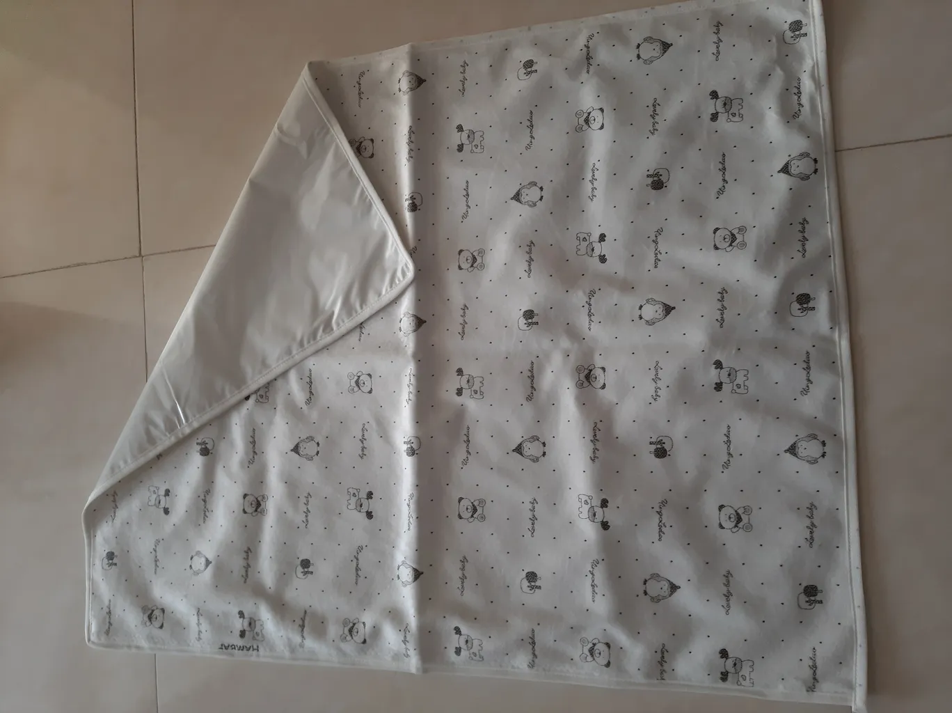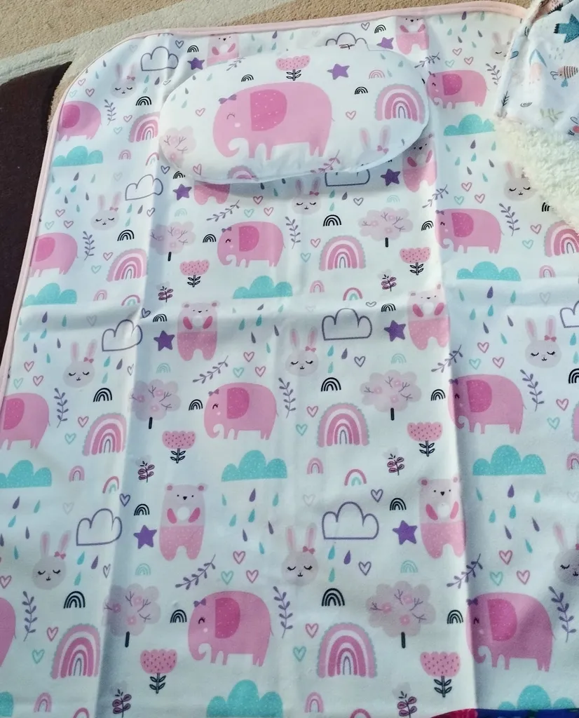 دوخت تمیز ، لایه رویی لطیف هست و بچه رو اذیت نمی کنه آب روش نریختم تست کنم اما مشخصه سه لایه هست و لایه وسطی پلاستیکی یا از جنس مشمبایی هست تا آب رد نکنه ، میتونست قیمت مناسب تر هم باشه ... تو بسته دوتا هست که خیلی خوبه میشه یکیش رو بزارید تو ساک همراه برای بیرون از خونه و یکی رو هم تو خونه استفاده کنید ابعاد حدودا یک متر مربع