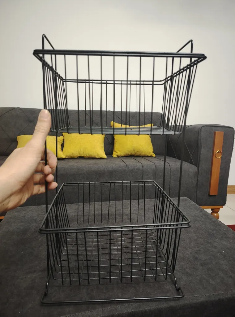 سبدی که پایین قرار میگیره خیلی کم از بالایی بزرگتر که سبد بالایی پایه هاش بتونه داخلش قرار بگیره