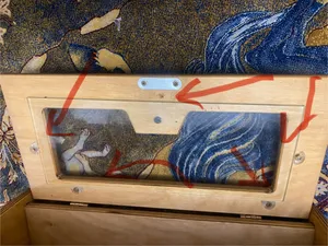 روش پر از منگنه هست ؛ این جا نونی توی عکس و از دور قشنگه، ولی از نزدیک که بهش نگاه میکنی روی دربش پر از منگنه هست و با منگنه و به طرز بی سلیقه ای فیکس شده. پارچه ی داخلش هم سوراخ داشت. بزرگه و جای زیادی هم میگیره. در کل من که راضی نیستم. نسبت به قیمتش میتوست ظریف تر کار بشه. اگه توی عکس هایی که گذاشتم دقت کنید میتونید ببینید