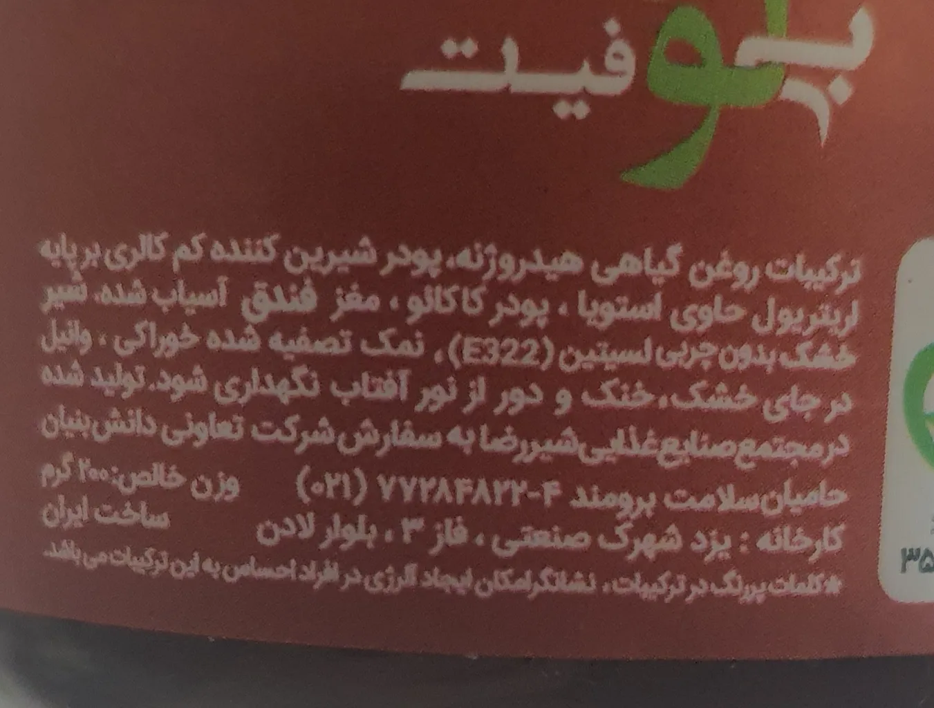 از هر ۱۰۰ گرم تقریبا ۵۰ گرم قند و ۳۵ گرم چربی هست اون ۱۵ باقیمونده هم شیرخشکی که یذره کاکائو نشونش دادن. حتی مزه روغن مایع هم نمیده روغن نباتیه. و انقدرررررر شیرینه که یه سر قاشقش دل ادمو میزنه و یکم ته مزه تلخی میده که اصلا دوست نداشتم. اصلا مزه کرم کاکائو نمیده. توصیه نمیکنم. 👎🏻👎🏻👎🏻👎🏻👎🏻