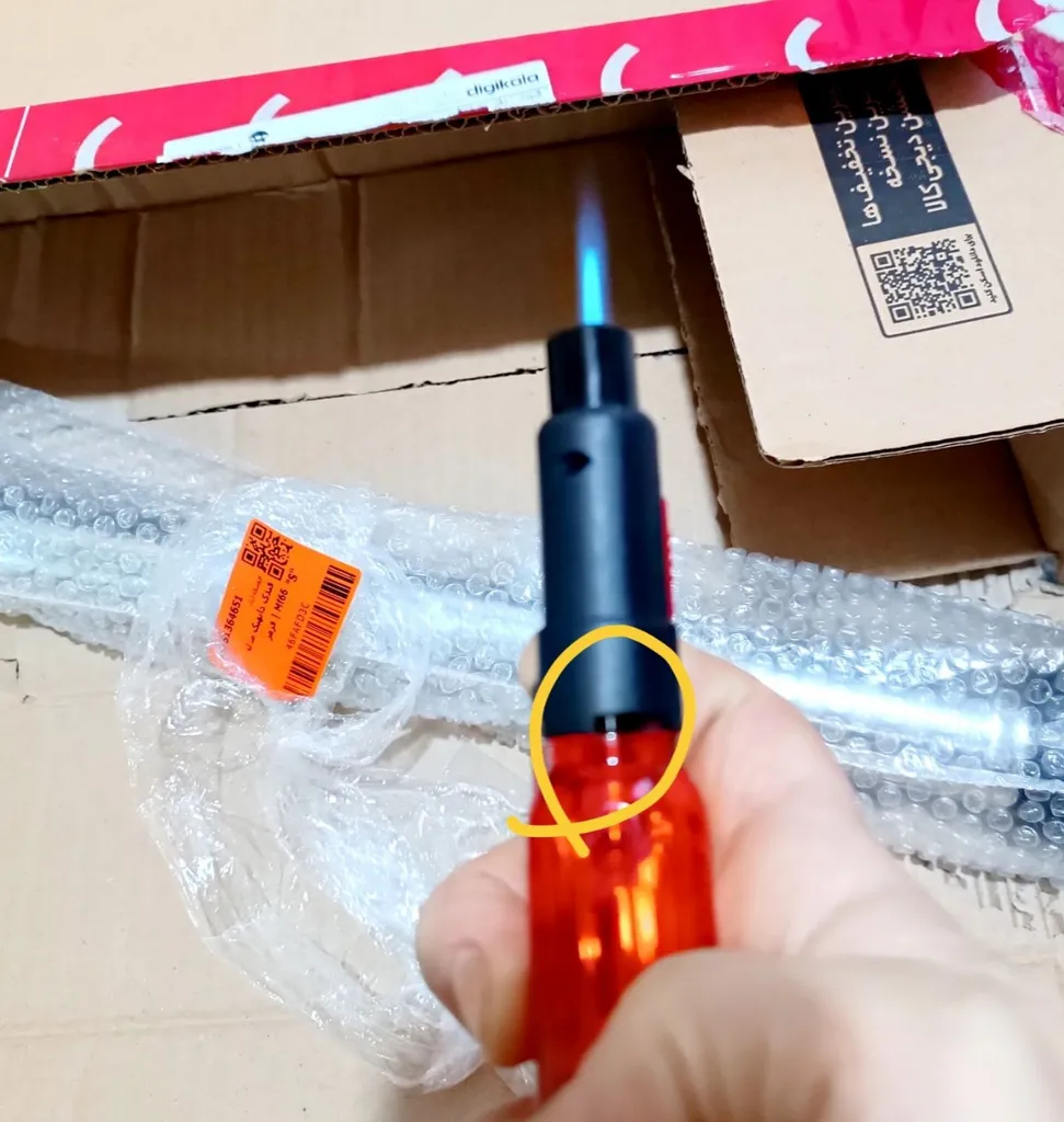 و در یک پلاستیک حبابی بود و توی کارتن دیجی کالا بود همین جعبه و چیزی نداشت شعلش عالیه و زیاد گازشم پر پر و عالییییی خییلیییی خوب هست فندک عالی هست صد در صد پیشنهاد میشه