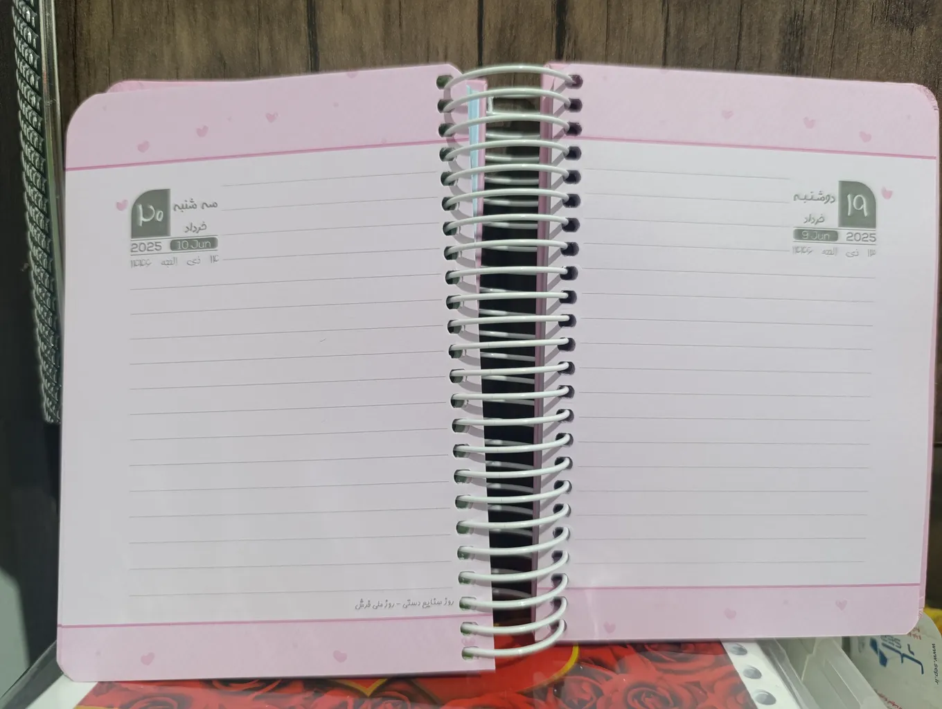 خریدار بدون نام : راستش خیلی با نمکه و دوست داشتنی ، انقدر بسته بندی شکیلی داشت و فروشنده با احترام بسته بتدی کرد توش شکلات گذاشته بود اولین بار همچنین برخوردی دیدم ،اما درباره ایرادش سیم فلز بسیار ضعیفی داره طوری که نمیشه قشنگ ورقش زد و به سختی صافش کردم و ورق زدن