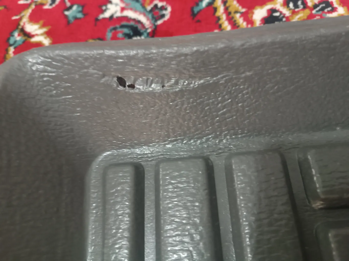 دوم اینه که به خاطر وکیوم بودن تو مشما بوی پلاستیک خیلی بدی داره و باید بعد از خرید دو روز بذارید جلو آفتاب بوش در بره وگرنه ماشین بوی بدی میگیره، سومین عیب هم اینه بسیار خاک گیره من حتی با دمپایی پا روش گذاشتم ولی کوچکتربن رد خاک رو جذب میکنه