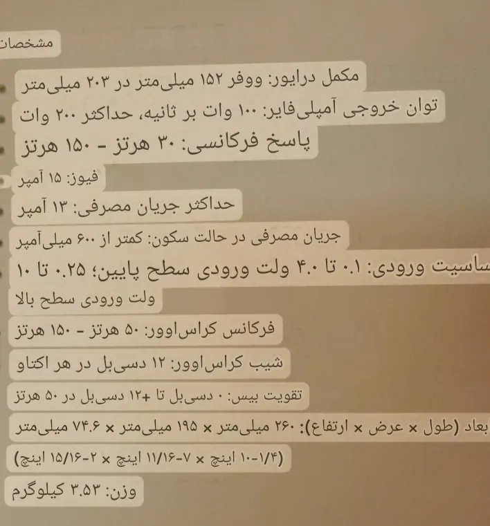 - ⬤ مزایا و نقاط مثبت کالاهای ایرانی : خریداران به مزایای مختلف بلندگوهای خودرو ساخت ایران اشاره میکنند. از جمله این مزایا میتوان به کیفیت صدای خوب، طراحی مناسب و نصب آسان اشاره کرد. بسیاری از کاربران از عملکرد این محصولات در شرایط مختلف ابراز رضایت کردهاند و به این نکته اشاره میکنند که این بلندگوها به خوبی نیازهای صوتی آنها را برآورده میکنند.