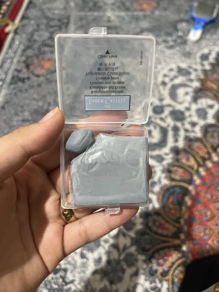 پاکن خمیری فابر کاستل ؛ عالی خیلی به دردتون میخوره توی طراحی ولی من توی نظرات دیدم بعضی از رنگای محصول جعبه ندارن من بیشتر برای جعبش گرفتم که توی کار کثیف نشه و رنگ طوسیش جعبه داره و من راضیم ازش و رنگشم خیلی خوشگله :)