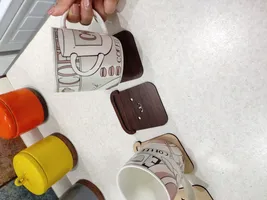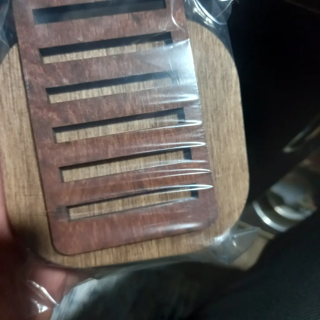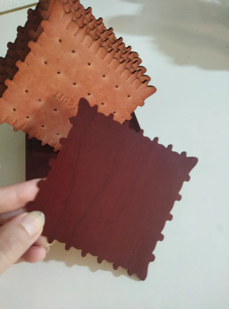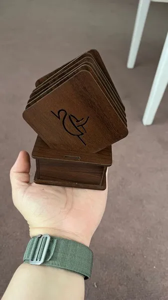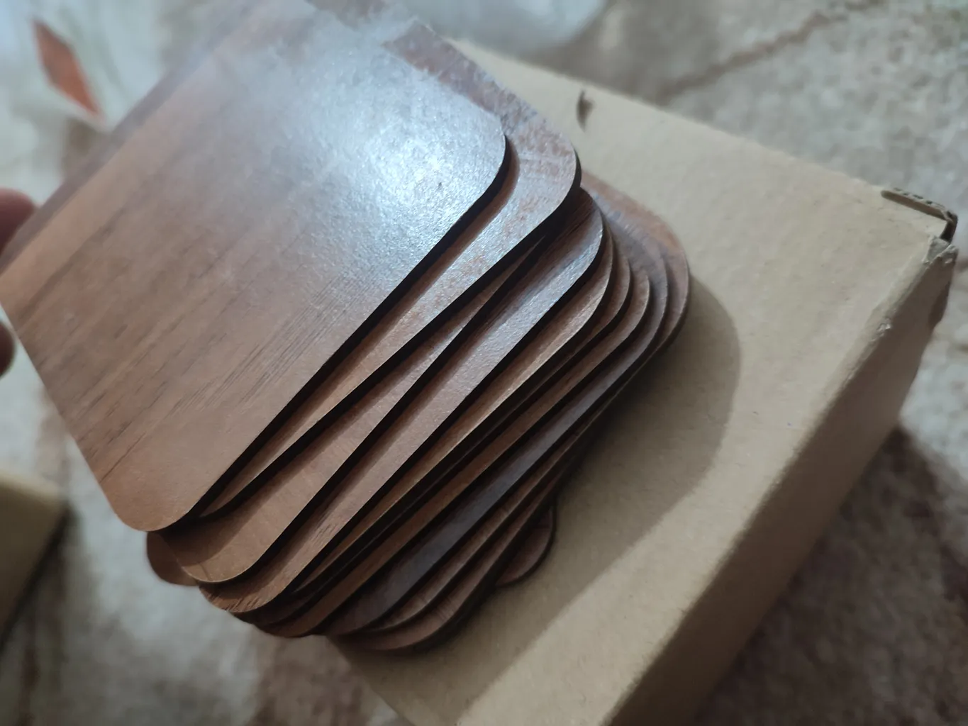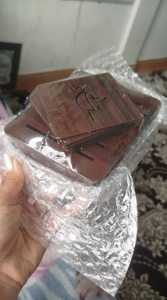امیر غفوری : زیر لیوانی ؛ یک مدل دیگه برای من فرستادن که مربع هست و هشت در هشت و خیلی کوچک. بُرش و طرح تمیز کار شده، اما کلا خیلی کثیف بود زیر لیوانی ها!! حدود نیم ساعت طول کشیده این شش تارو با دستمال کاغذی تمیز کنم و باورم نمیشد چرا اینقدر کثیف بود!! مراقب باشید که حتما تمیزشون کنید با دستمال مرطوب، و لیوان و فنجان خودتون رو روی اونهمه آلودگی نزارید