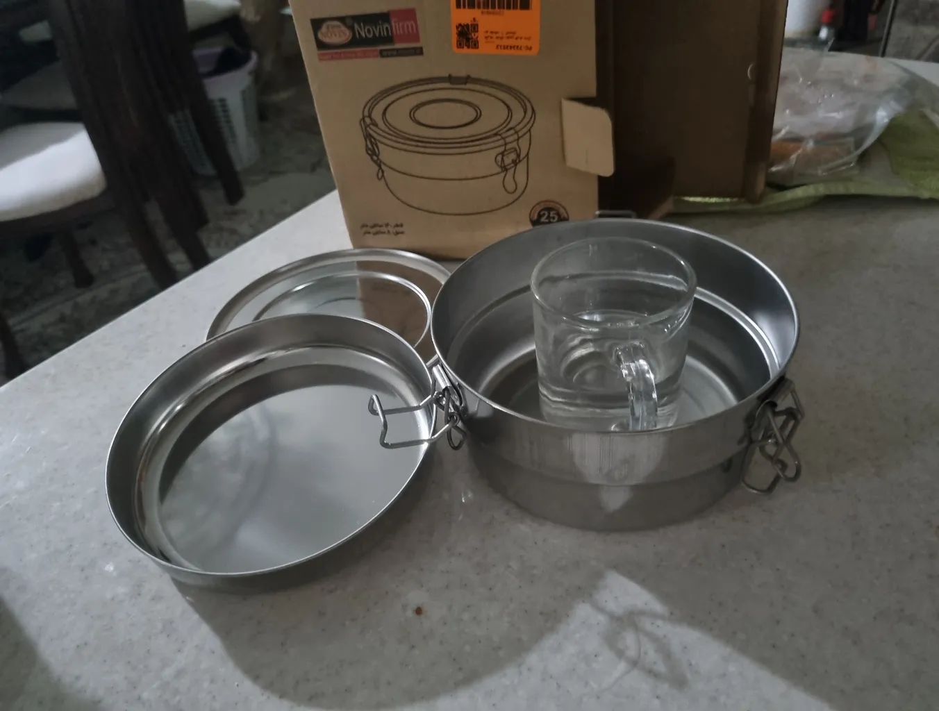 شیک و خوشگله،ولی مال من عکس خرس روش داشت که کار رو یکم بچگانه میکرد برای همین پس دادم.۳ تا ظرف دارهو اون ظرف بزرگترش واقعا جاداره و میشد سیر شد باهاش،پر کردنش راحته ولی استفاده ممکنه با قاشق و جنگهای که خودشون گذاشتن اذیت بشین و پی در پی تا بشه و اذیت کننده باشه،خودتون قاشق داشته باشین بهتره،جنس و کیفیت هم باید بگم استیل نگیر هست و کاربردی هم هست توی خرید شک نکنین ولی فکر میکنم درجه ۲ باشه چون آهنربا یکم بهش می چسبید ولی بازم مشکلی نیست و میشه توی ماکرویو گذاشت