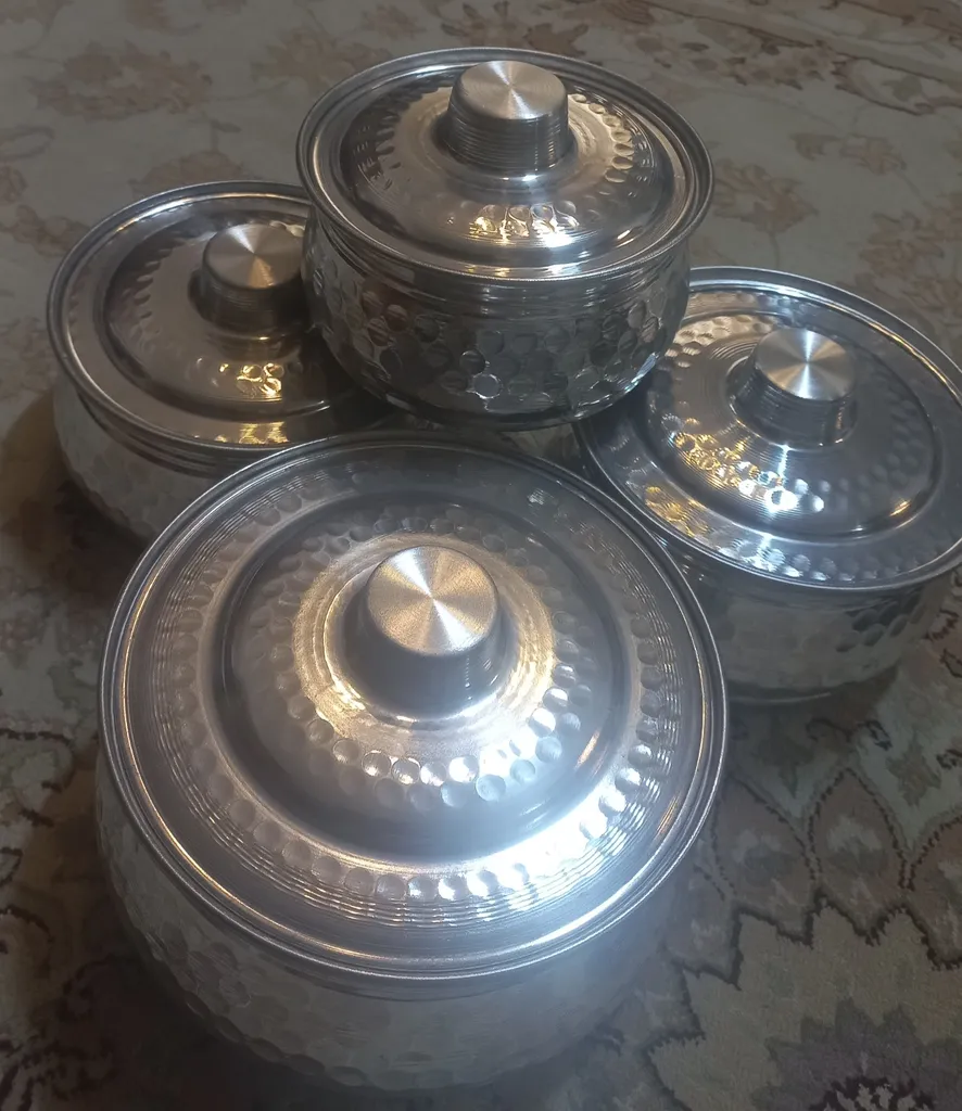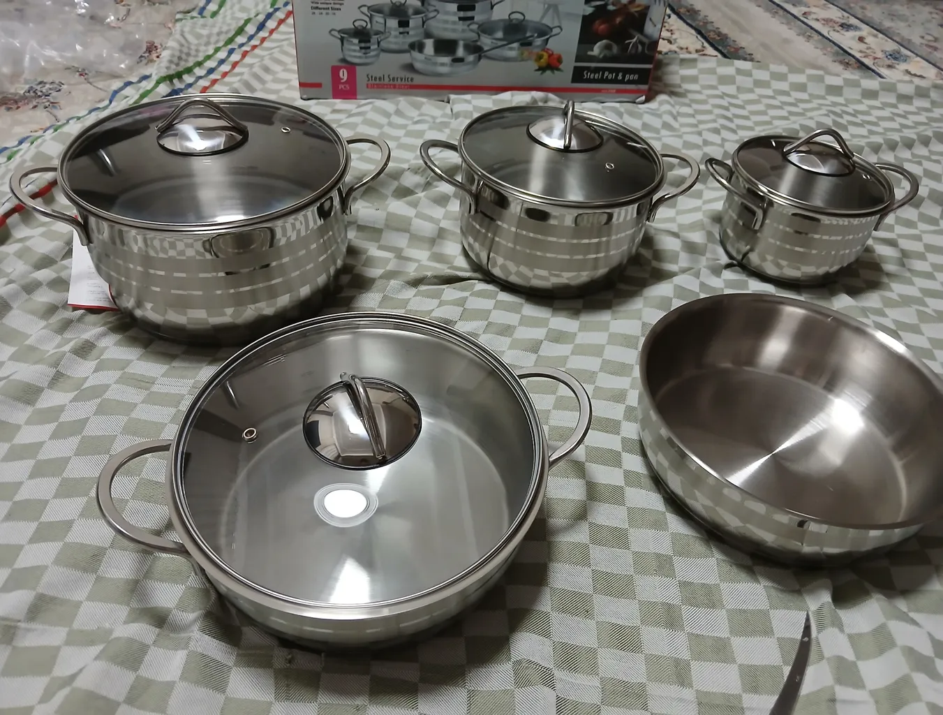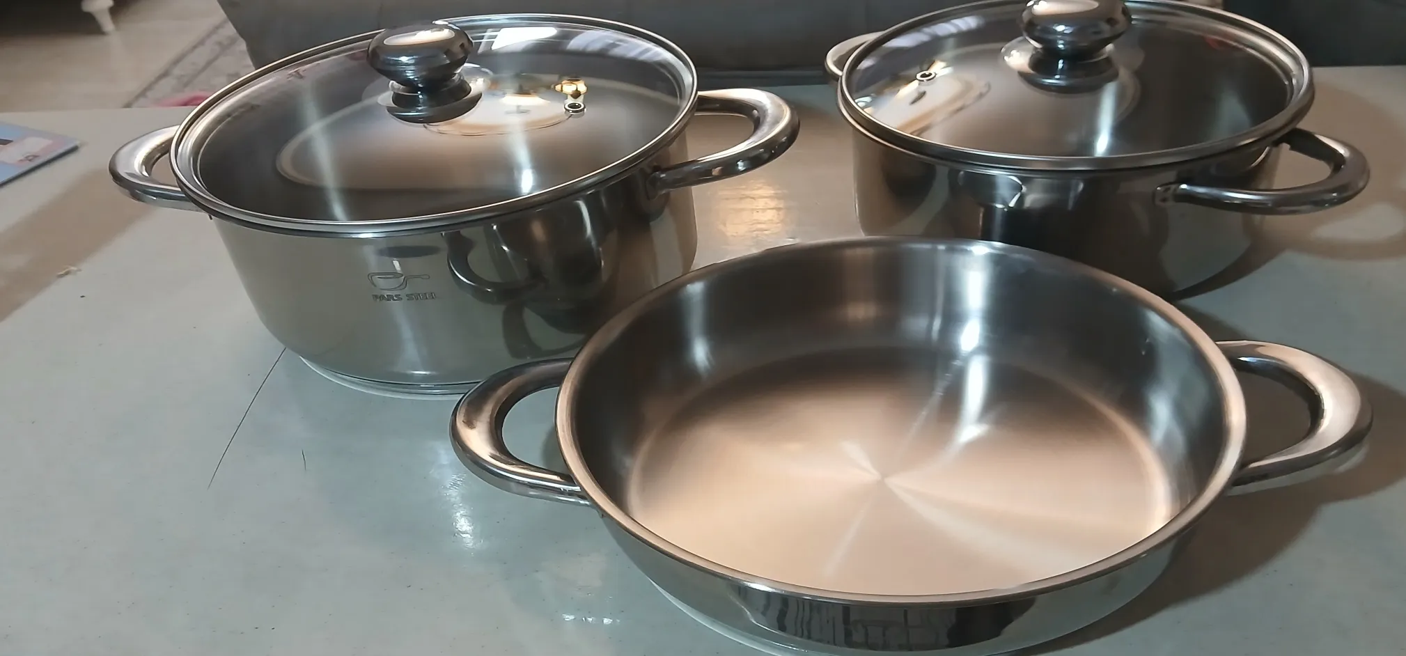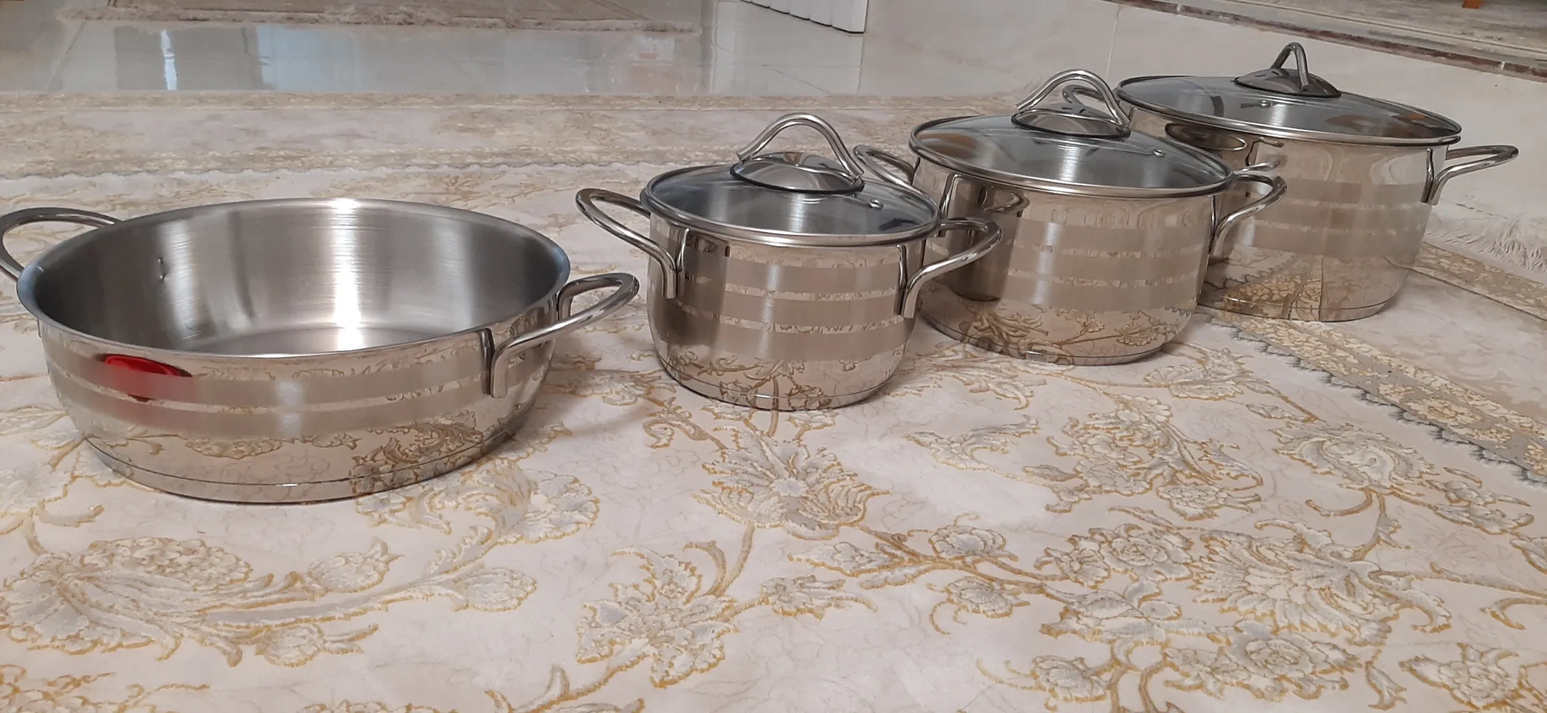 - ⬤ استیل ضد زنگ : استیل ضد زنگ یکی از محبوبترین جنسها برای سرویسهای پخت و پز است. این جنس مقاوم در برابر زنگزدگی و خوردگی است و به راحتی تمیز میشود. خریداران به دوام و زیبایی استیل اشاره کردهاند، اما برخی از آنها از سنگینی و قیمت بالای آن ناراضی بودند.