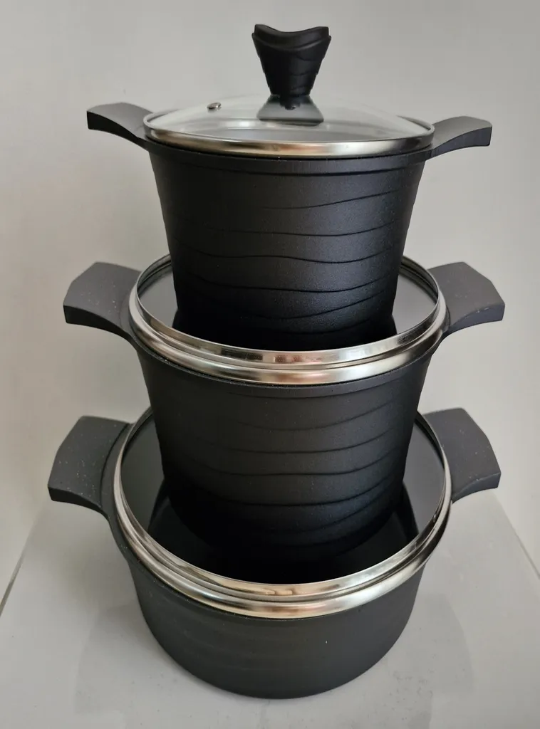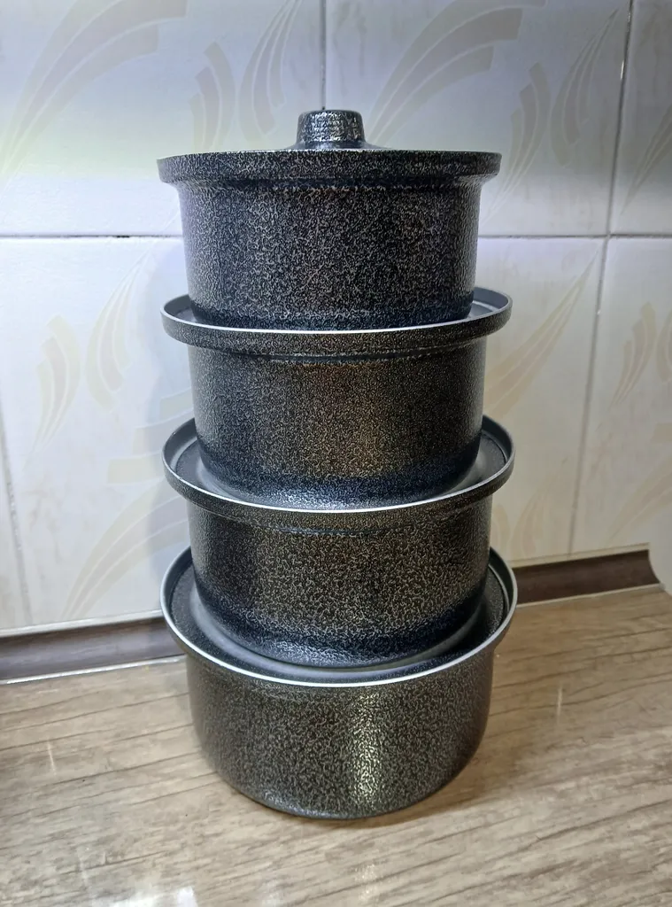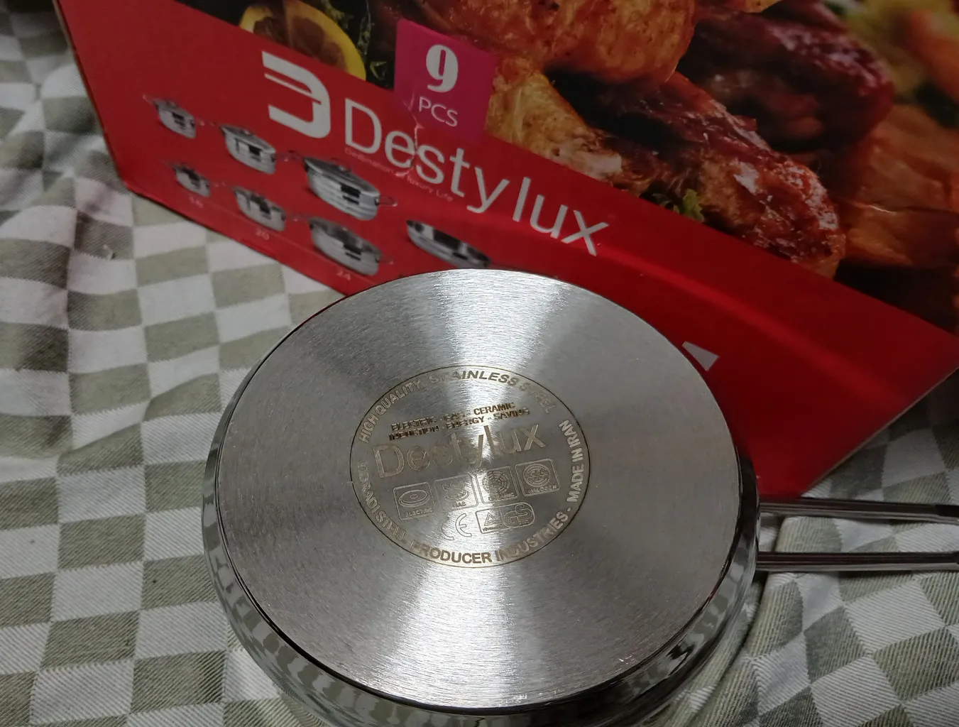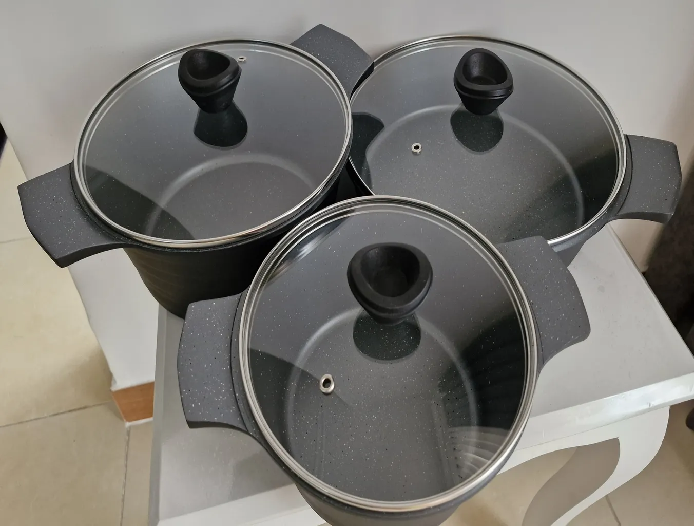 - ⬤ استیل ضد زنگ : استیل ضد زنگ یکی از محبوبترین جنسها برای سرویسهای پخت و پز است. این جنس مقاوم در برابر زنگزدگی و خوردگی است و به راحتی تمیز میشود. خریداران به دوام و زیبایی استیل اشاره کردهاند، اما برخی از آنها از سنگینی و قیمت بالای آن ناراضی بودند.