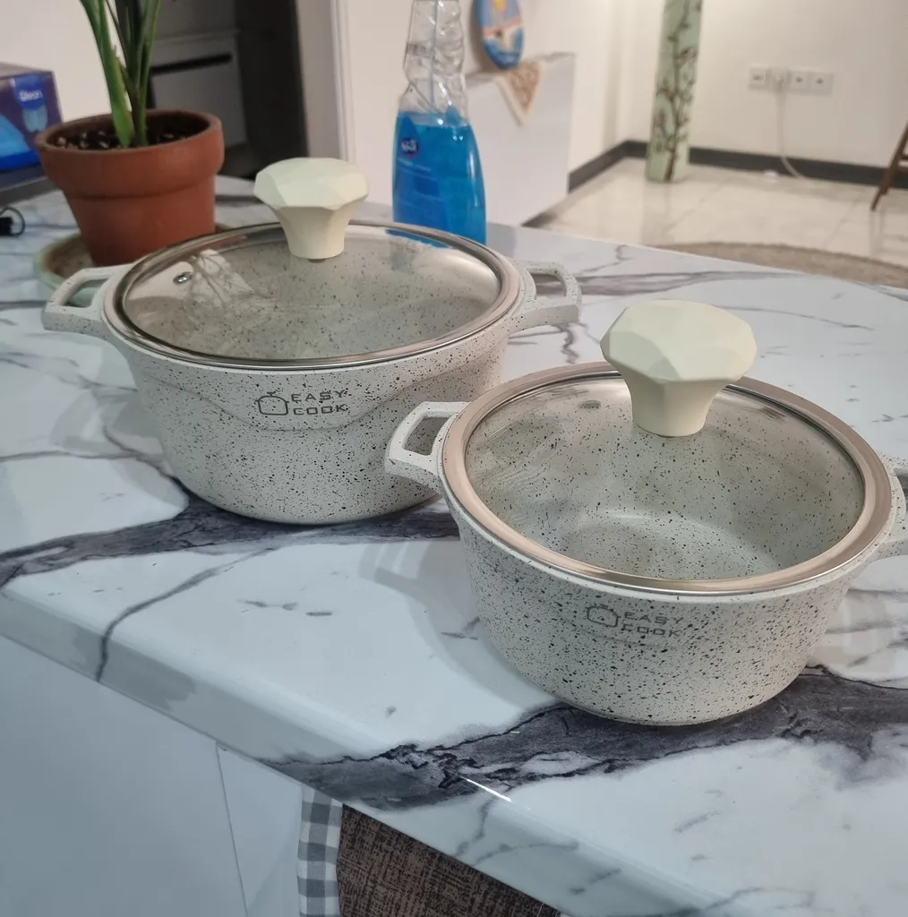 - ⬤ جنس رویه و بدنه : جنس رویه و بدنه باید با کیفیت و مقاوم باشد. خریداران به جنسهای مختلفی مانند استیل، چدن، آلومینیوم، گرانیت و سرامیک اشاره کردهاند. هر کدام از این جنسها ویژگیهای خاص خود را دارند که میتواند بر انتخاب شما تأثیر بگذارد.