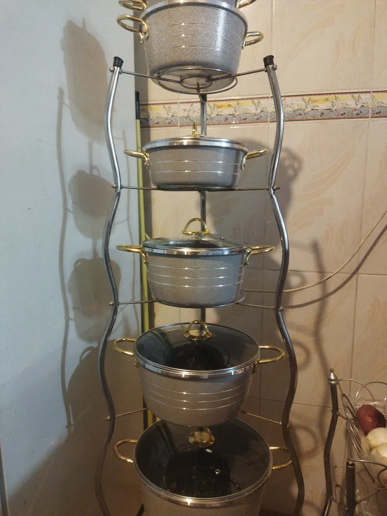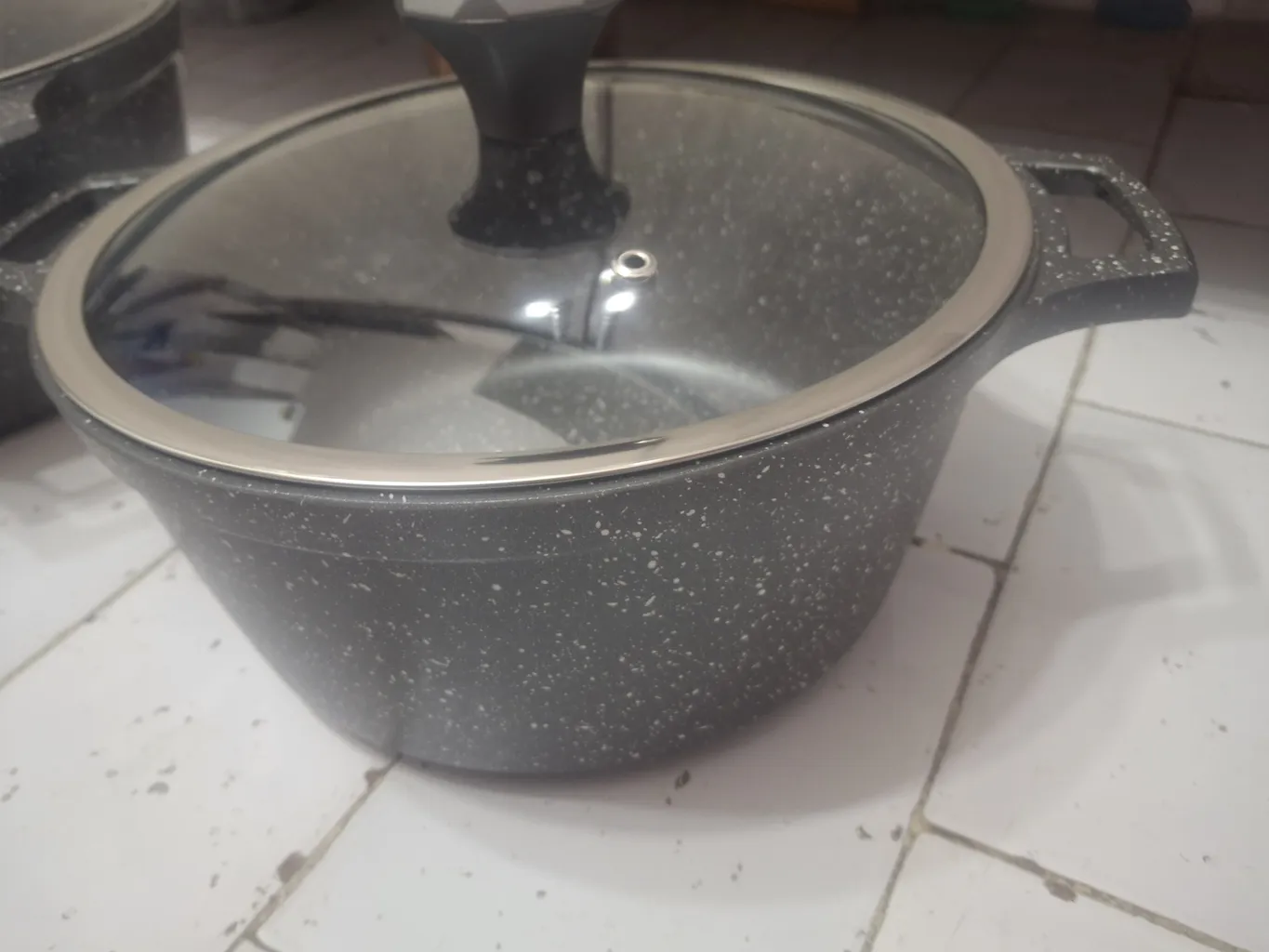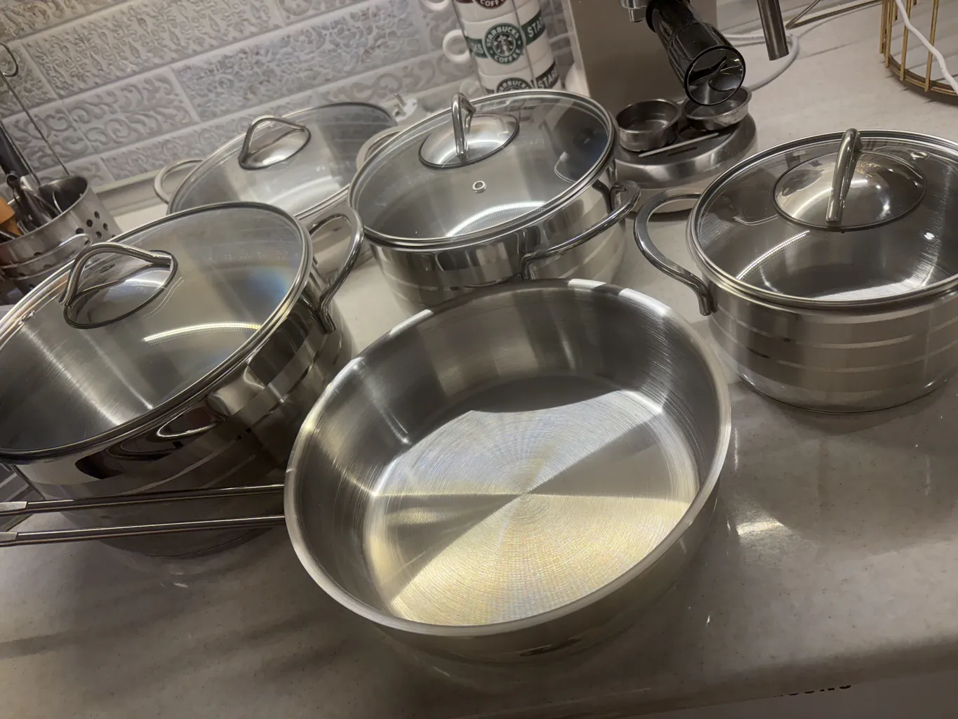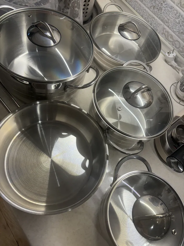 - ⬤ استیل ضد زنگ : استیل ضد زنگ یکی از محبوبترین جنسها برای سرویسهای پخت و پز است. این جنس مقاوم در برابر زنگزدگی و خوردگی است و به راحتی تمیز میشود. خریداران به دوام و زیبایی استیل اشاره کردهاند، اما برخی از آنها از سنگینی و قیمت بالای آن ناراضی بودند.