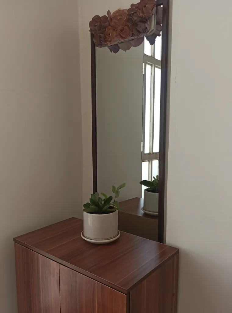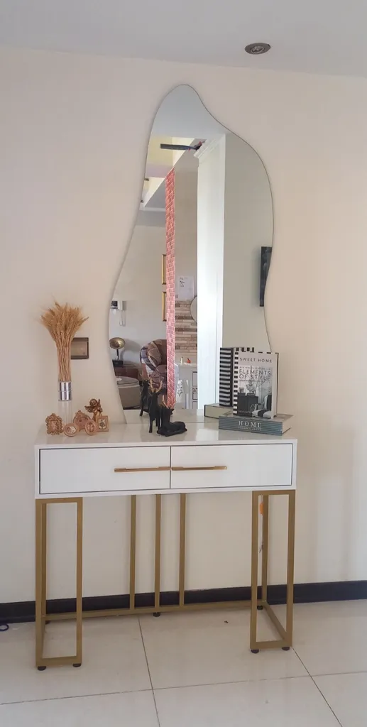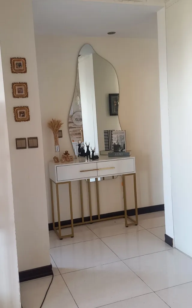 - ⬤ آینه و کنسول : این نوع آینهها معمولاً به همراه یک کنسول یا میز طراحی میشوند و به عنوان یک مجموعه دکوراتیو در فضاهای مختلف استفاده میشوند. خریداران از زیبایی و کارایی این مجموعهها راضی هستند و به طراحی شیک و مدرن آنها اشاره کردهاند. اما برخی از مشتریان به قیمت بالای این مجموعهها و عدم وجود فضای کافی برای قرار دادن وسایل در کنسول انتقاد کردهاند.