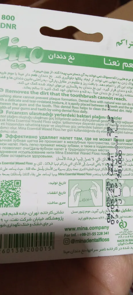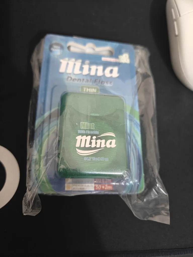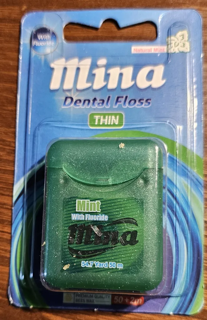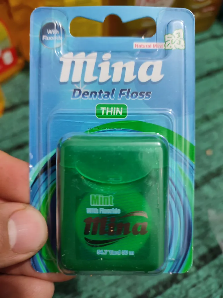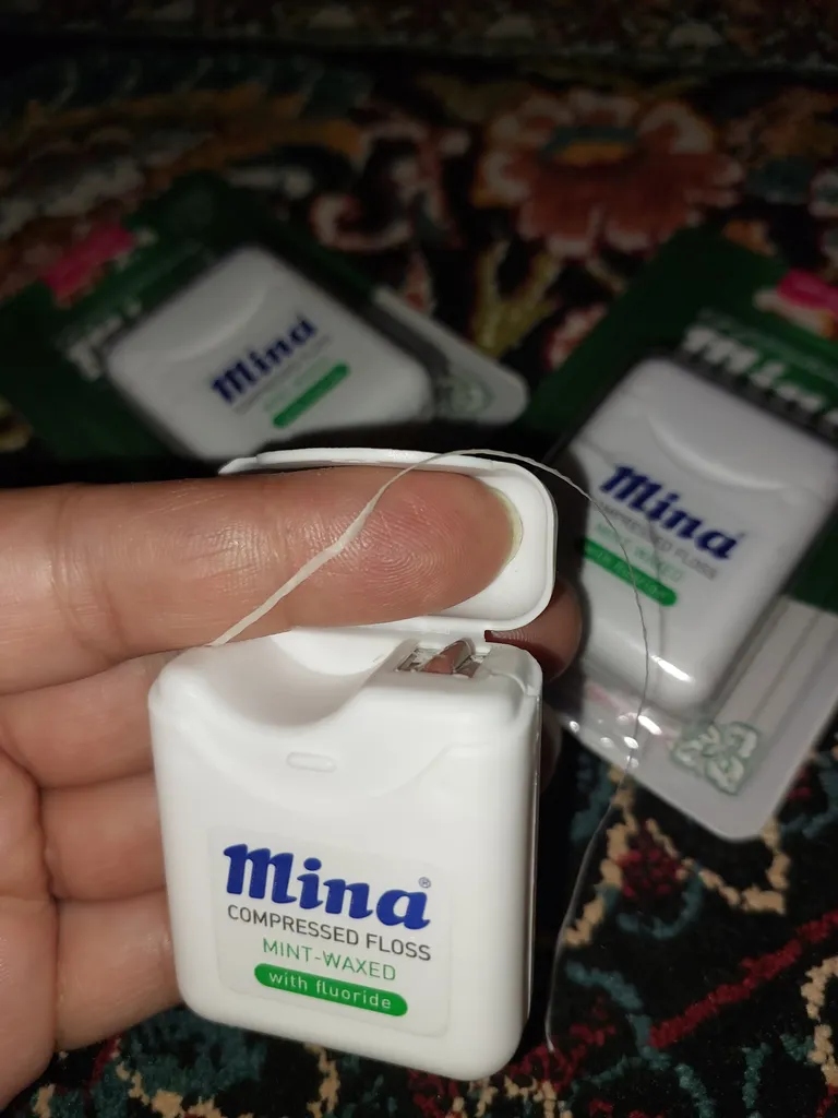 نخ دندان مینا ؛ امیدوارم عکس نشون بده که ضخامتش چقدر هست. خیلی نازک نیست که به لثه آسیب بزنه و خیلی هم پهن نیست که لای دندون نره. برای من که مناسب هست و چندبار هم این خرید رو تکرار کردم