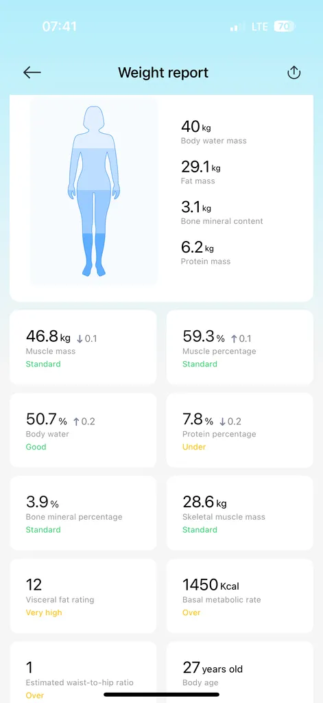 - ⬤ ترازو هوشمند : این نوع ترازوها قابلیتهای پیشرفتهتری دارند و معمولاً به اپلیکیشنهای موبایل متصل میشوند. خریداران از امکاناتی مانند اندازهگیری درصد چربی، آب و عضلات بدن و همچنین قابلیت پیگیری تغییرات وزن در طول زمان راضی هستند. با این حال، برخی از کاربران به عدم دقت در محاسبات و نیاز به کالیبراسیون مکرر اشاره کردهاند. همچنین، قیمت بالای این ترازوها ممکن است برای برخی از خریداران یک مانع باشد.