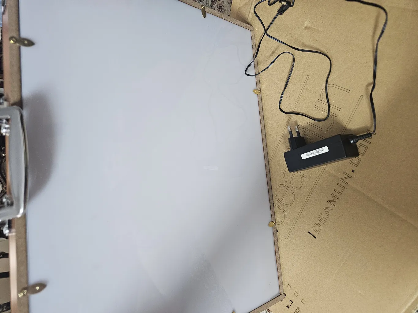 و شیشه کنار چوب با منگنه هایی که زده شده شیشه را محکم کرده اند و زیر شیشه خیلی قابل اطمینان نیست چراغ داخل آن نیست و ال ای دی های کوچک در اطراف چوب چسبانده شده و کف آن فویل است من چون نیاز به نور بیشتر داشتم چون روی مقوا باید طرح هایم را بیندازم مجبور شدم میز نور را باز کرده و بیرون ببرم و از چراغ های ال ای دی آن در وسط کار قرار دهم تا بتواند کار را روی مقوا نشان دهد عکس قبل و بعد میز نور را قرار میدهم امیدوارم عکس ها باز بشن ببینید و با دید باز خرید کنید کلا نسبت به قیمت خیلی مناسب نبود بخصوص من مجبور شدم ۷۵ هزار هم اضافه هزینه کنم موفق باشید