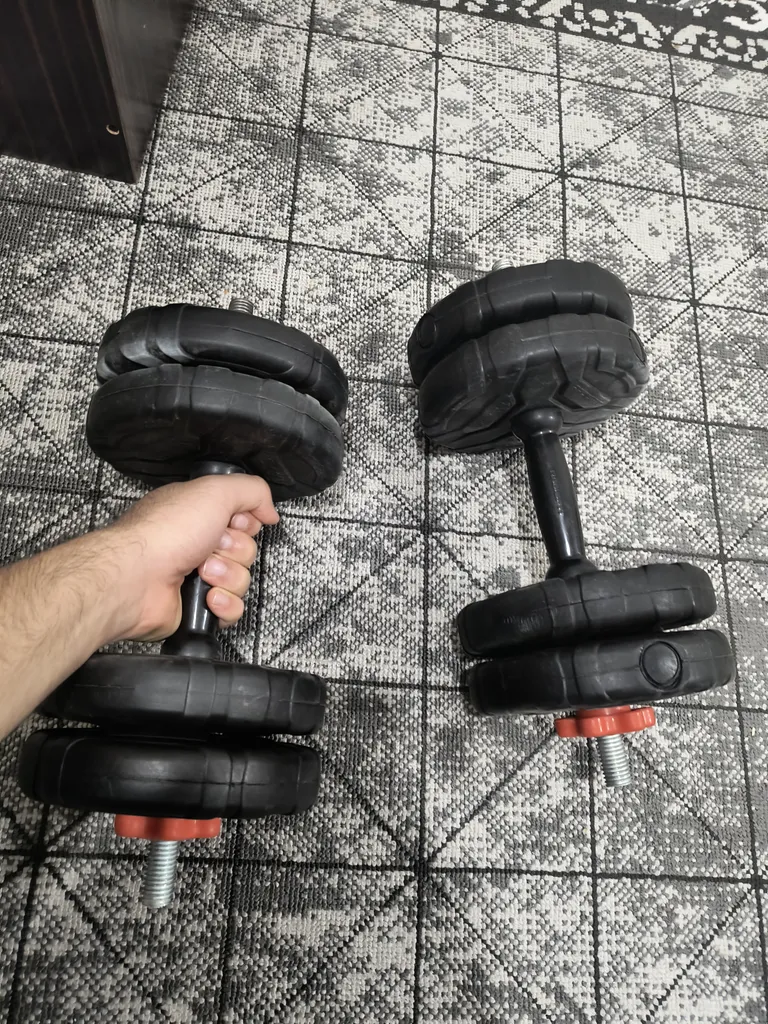 - ⬤ دمبلهای قابل تنظیم : این دمبلها به کاربران این امکان را میدهند که وزن آنها را با توجه به نیاز خود تغییر دهند. این نوع دمبلها به عنوان ابزاری بسیار کاربردی شناخته میشوند، زیرا میتوانند با یک دمبل، وزنههای مختلفی را تجربه کنند. خریداران به صرفهجویی در فضا و هزینه به عنوان مزیت این نوع دمبلها اشاره کردهاند. اما برخی از آنها به مشکلاتی مانند سختی در تعویض وزنهها و کیفیت پایین برخی مدلها انتقاد کردهاند. همچنین، برخی خریداران به بوی نامطبوع پلاستیک و عدم تطابق وزن واقعی با آنچه که اعلام شده، اشاره کردهاند.