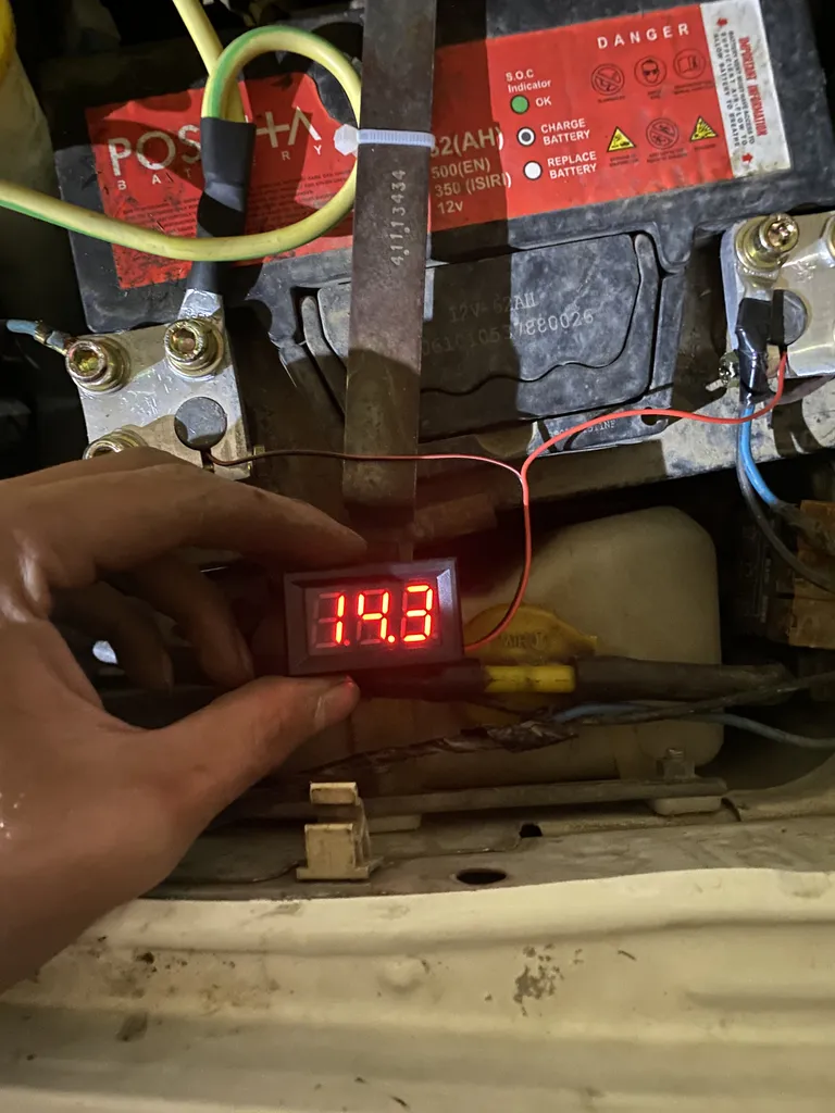 در کل زمانی که ماشین خاموشه باید ۱۲ خورده ای و زمانی که روشن میشه ۱۳ و خورده ای یا ۱۴ خورده ای رو نشون بده و اگر فن یا چیزی دیگه روشن بشه مقدار بیا ۱۲ تا ۱۴ میشه در هنگام روشن بودن