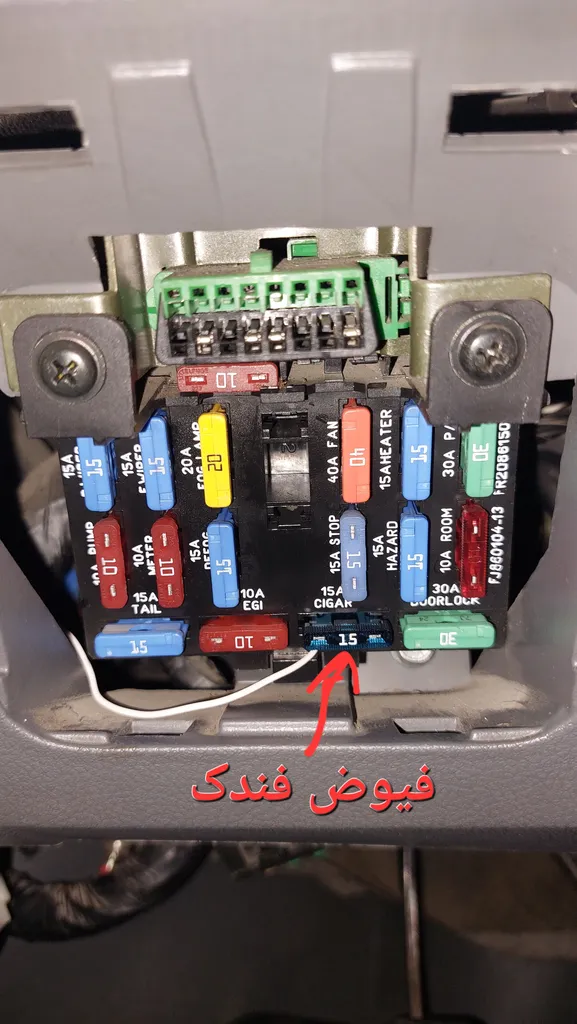 فضای درب جعبه فیوز به برق هم نزدیکه و سیم کشی زیاد لازم نداره ، فقط از یک سوکت قفلی دو سیم استفاده کنید که برای باز کردن جعبه فیوز ، کارهای دیاگ و چک فیوز ، راحت با باز کردن قفل سوکت از پشت درب ، درب جدا بشه ، من یک فیوز 0.5 آمپر شیشه ای هم روی ورودی مثبت نصب کردم