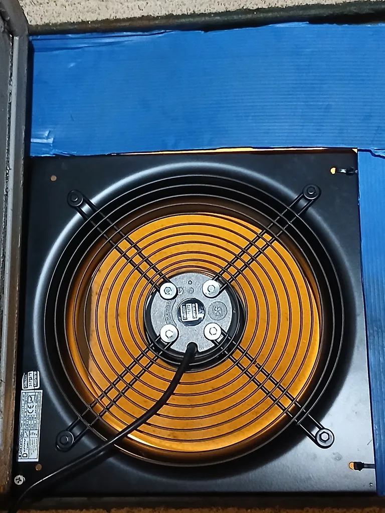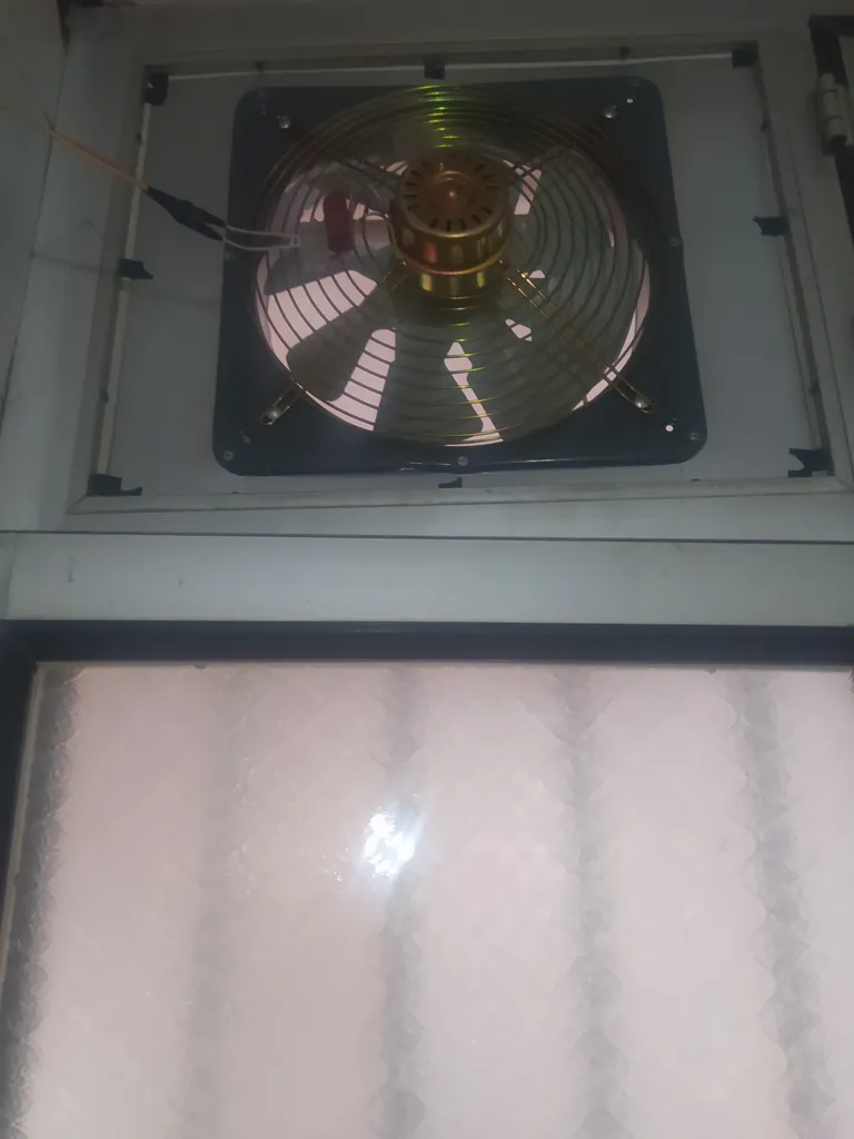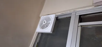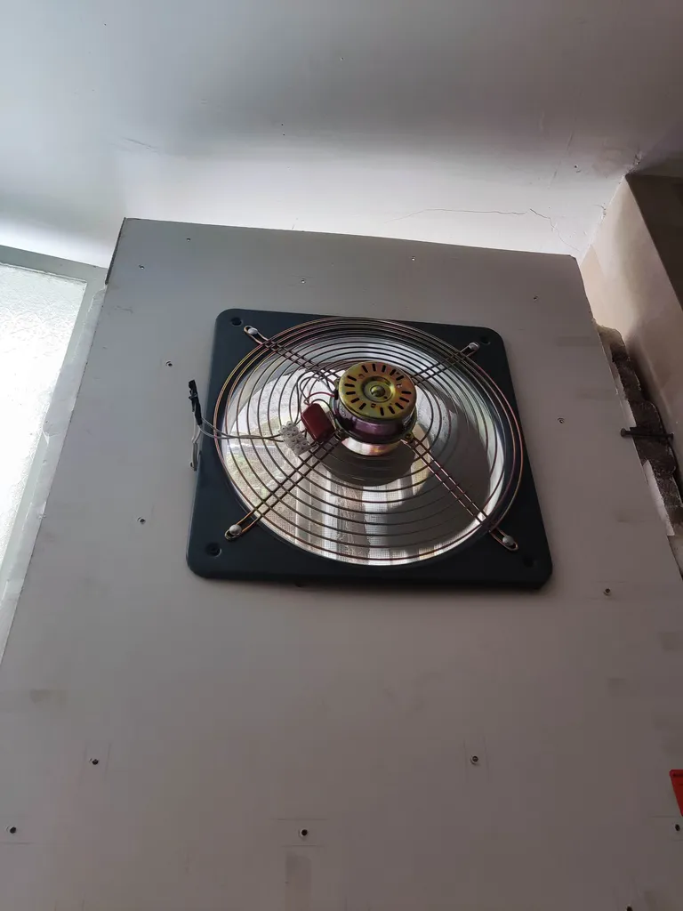 هواکش رو بین دو لنگه پنجره کشویی فیکس کردم و بالاش رو با مقوای کلفت بستم
