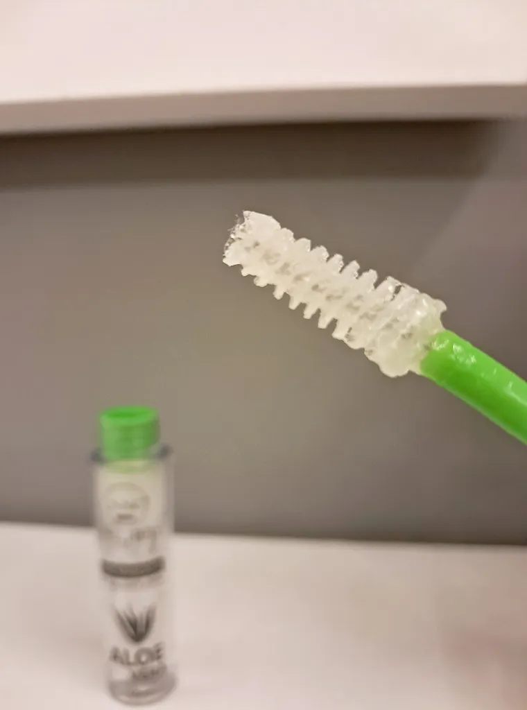 مورد دوم میزان غلظت بیش از ژل هست که باعث میشه مقدار زیادی با برس بیرون بیاد و کنترلش روی ابرو سخت بشه، توی عکسی که گذاشتم مشخصه.. تلاش برای فرم دادن ابرو با این حجم از ژل، منجر به دفعات بیشتر برس کشیدن و در نهایت سفیدک زدن میشه