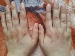 برای مقایسه: دست راست حدودا یک ربع با این ماسک پوشونده شده و روشن تر شد یک لایه برداری خفیفی داره و اثرش یک روزه