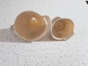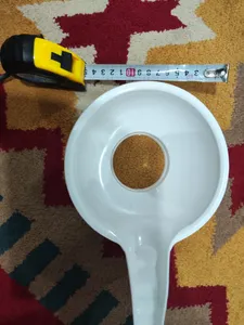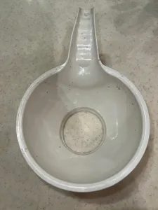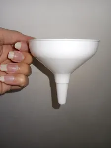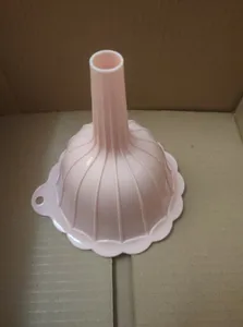 قیف ؛ از پلاستیک ضایعاتی ساخته شده و ذرات سیاه در بافت داره. ضمنا بدنه قیف مثل پنیر کنده میشود. قالبگیری ضعیف و ناهمگون دارد. عکسشو هم میزارم. برای مواد غذایی آل آلوده و ناسالم است!