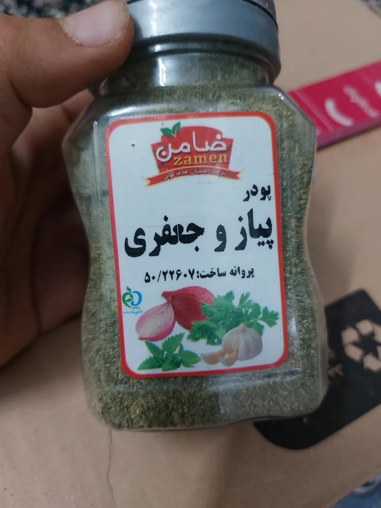 ادویه خوش طعم پیاز و جعفری ضامن ؛ مدت هاست از محصولات ضامن استفاده می کنم و راضیم. این پودر پیاز و جعفری هم طعم دهنده بسیار خوبی برای غذاست.