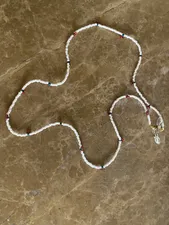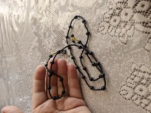 بند خوب و سبکی هست من دوست داشتم اندازه ش هم معقوله رنگ اکثر مهره ها سفید هست و تک تک طلایی داره