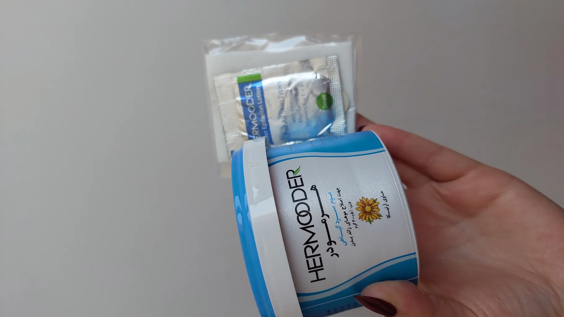 سلام مارک های مختلفی استفاده کردم و راضی نبودم اما فقط پودر موبر هرمودر اونم این مدل آبی راضی بودم و جای جوش روی پوست نذاشت چون مناسب پوست های حساسه سعی کنید بین 5 الی 7 دقیقه باشه بیشتر نزارید