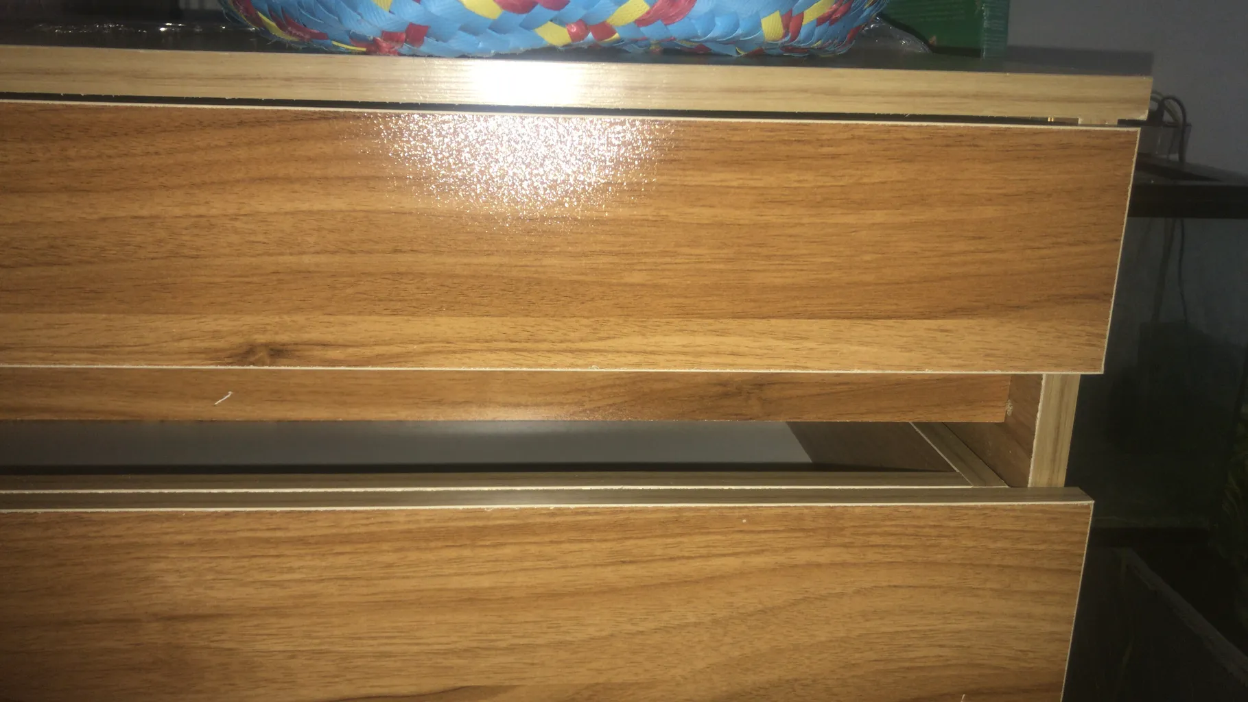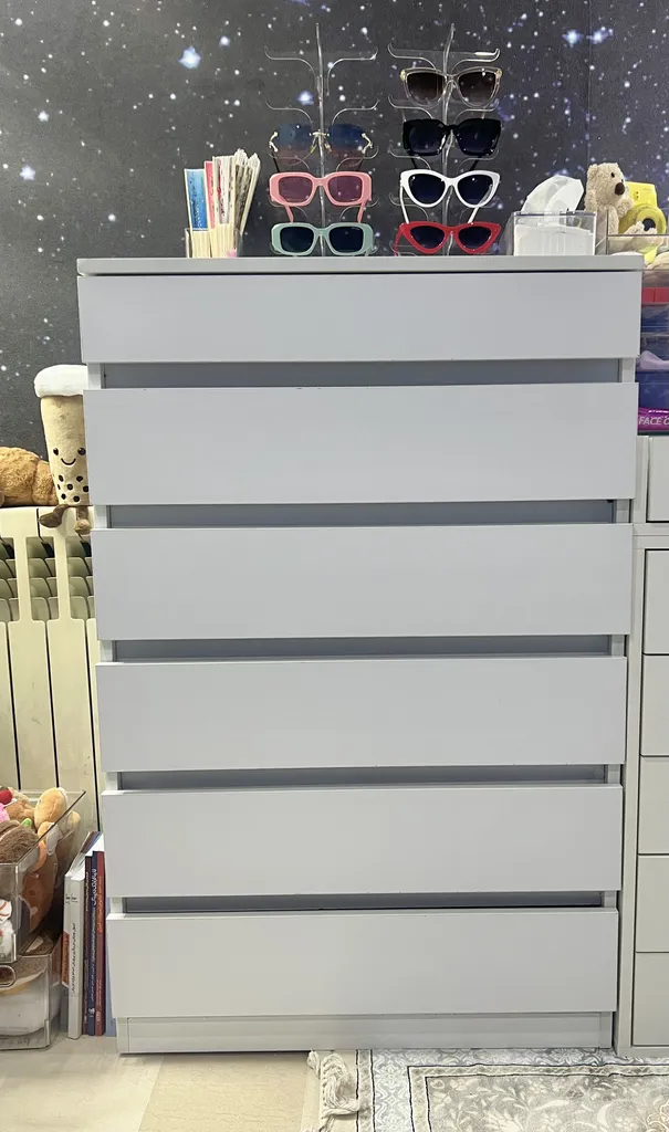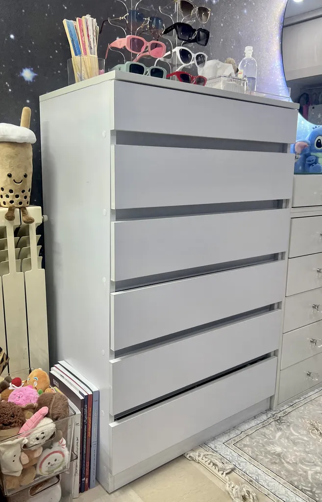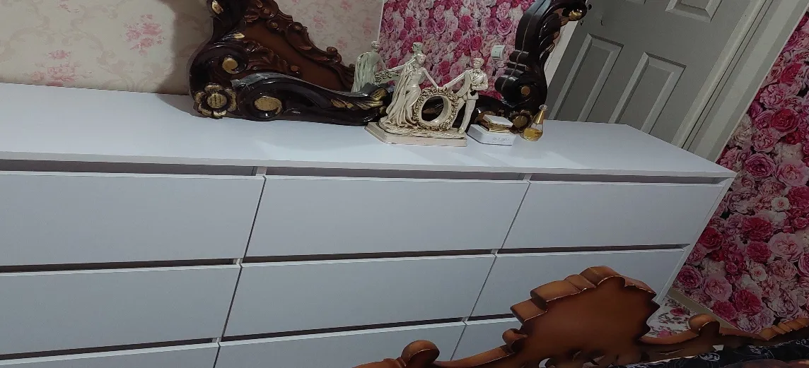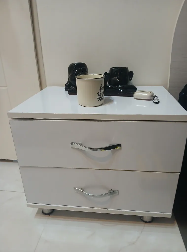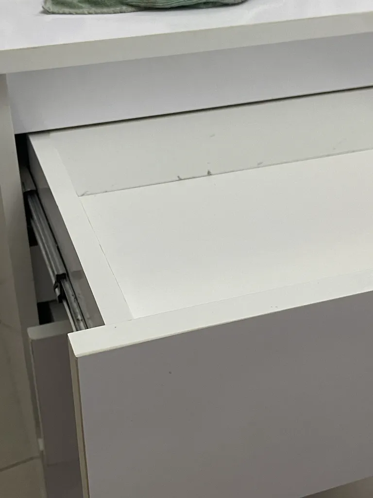 اما فروشنده اصلا تمیز کار نکرده بود اول اینکه قسمت داخلی دراور ترک داشت اما چون به سختی میشه دید مرجوع نکردم دوم اینکه اصلا با ظرافت کار نشده بود کشو ها کمی کج هستند برخی قسمت ها چسبش بیرون ریخته بود با این حال باز کردن کشو ها که بصورت فشاری هست کار میکنه اما من ترجیح میدم ازش استفاده نکنم چون خیلی صدا میده مورد سوم اینکه کلی جای ماژیک داشت که به سختی پاکشون کردم