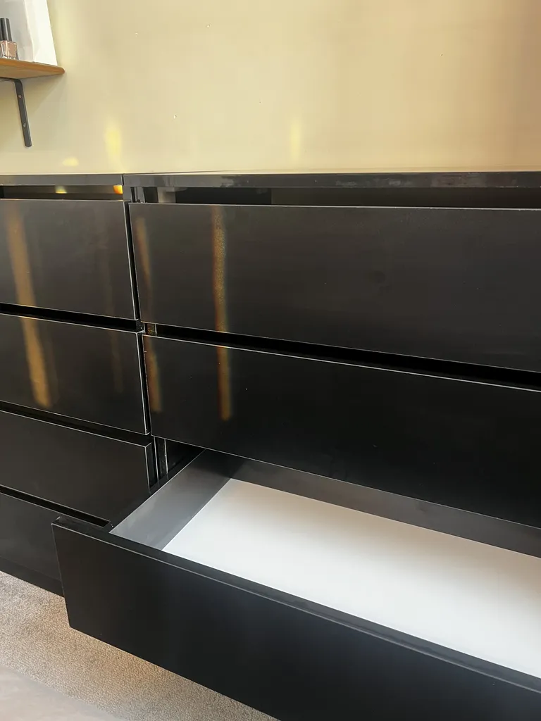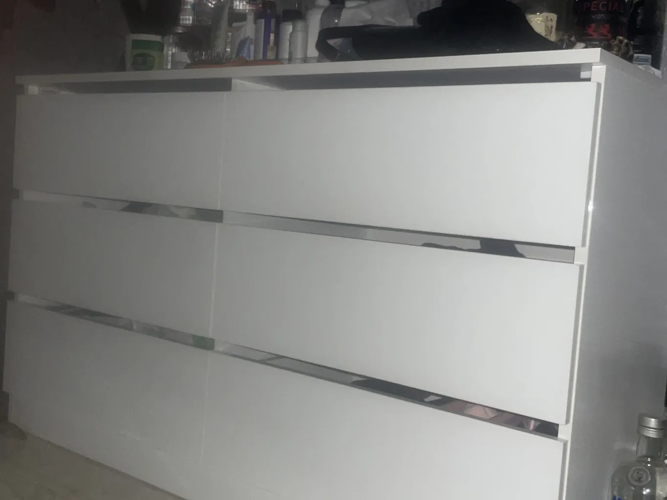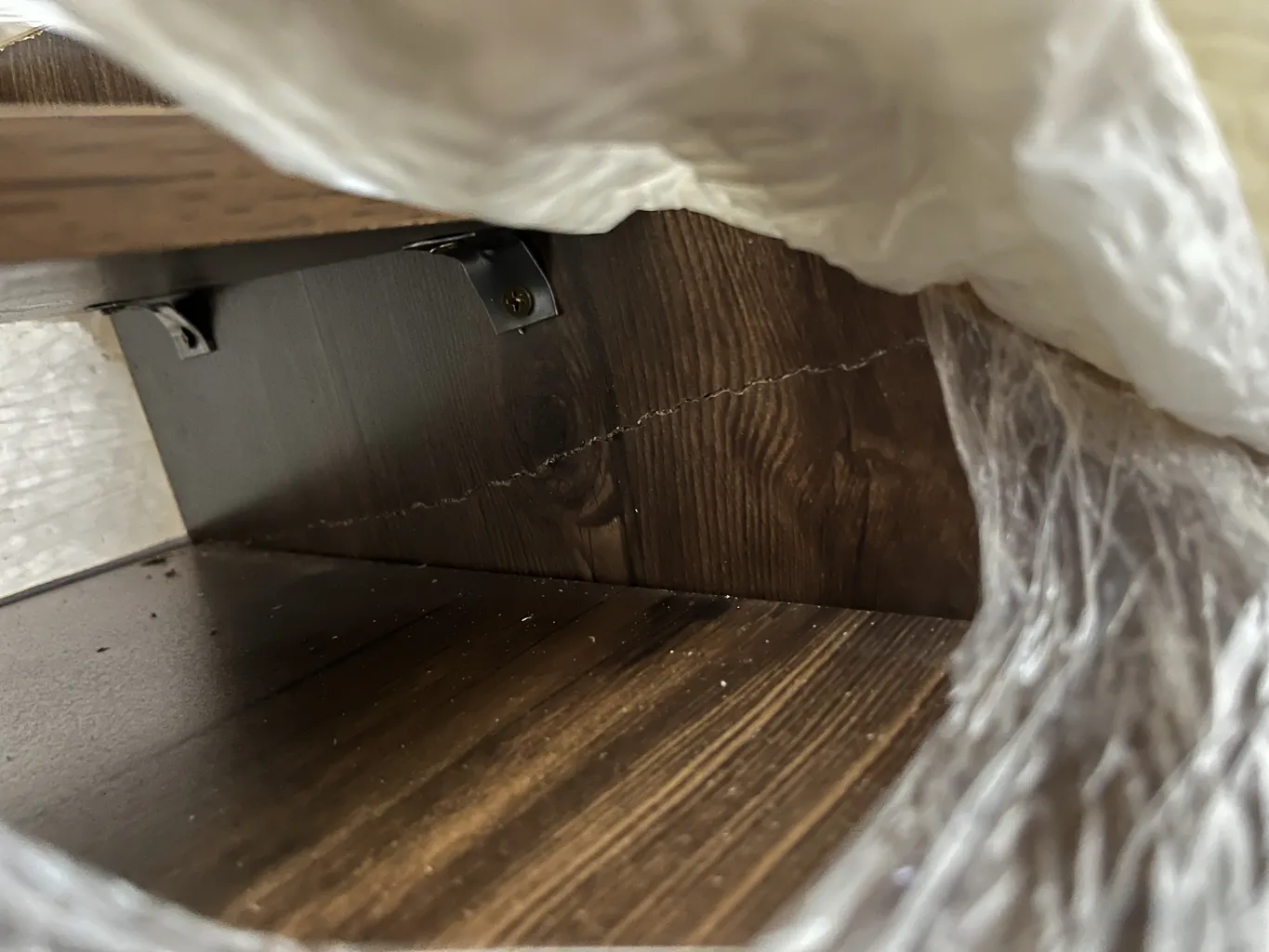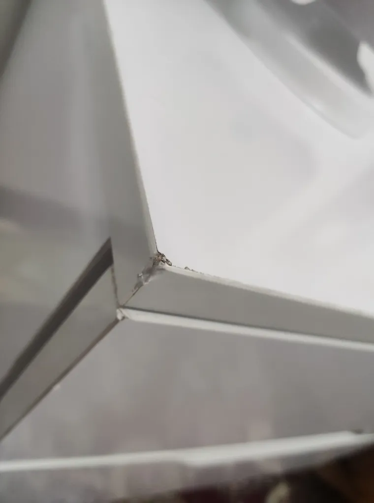 اما فروشنده اصلا تمیز کار نکرده بود اول اینکه قسمت داخلی دراور ترک داشت اما چون به سختی میشه دید مرجوع نکردم دوم اینکه اصلا با ظرافت کار نشده بود کشو ها کمی کج هستند برخی قسمت ها چسبش بیرون ریخته بود با این حال باز کردن کشو ها که بصورت فشاری هست کار میکنه اما من ترجیح میدم ازش استفاده نکنم چون خیلی صدا میده مورد سوم اینکه کلی جای ماژیک داشت که به سختی پاکشون کردم
