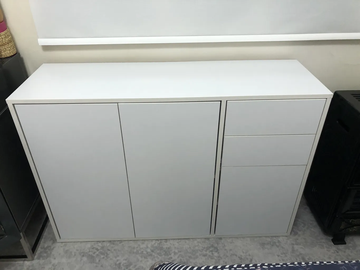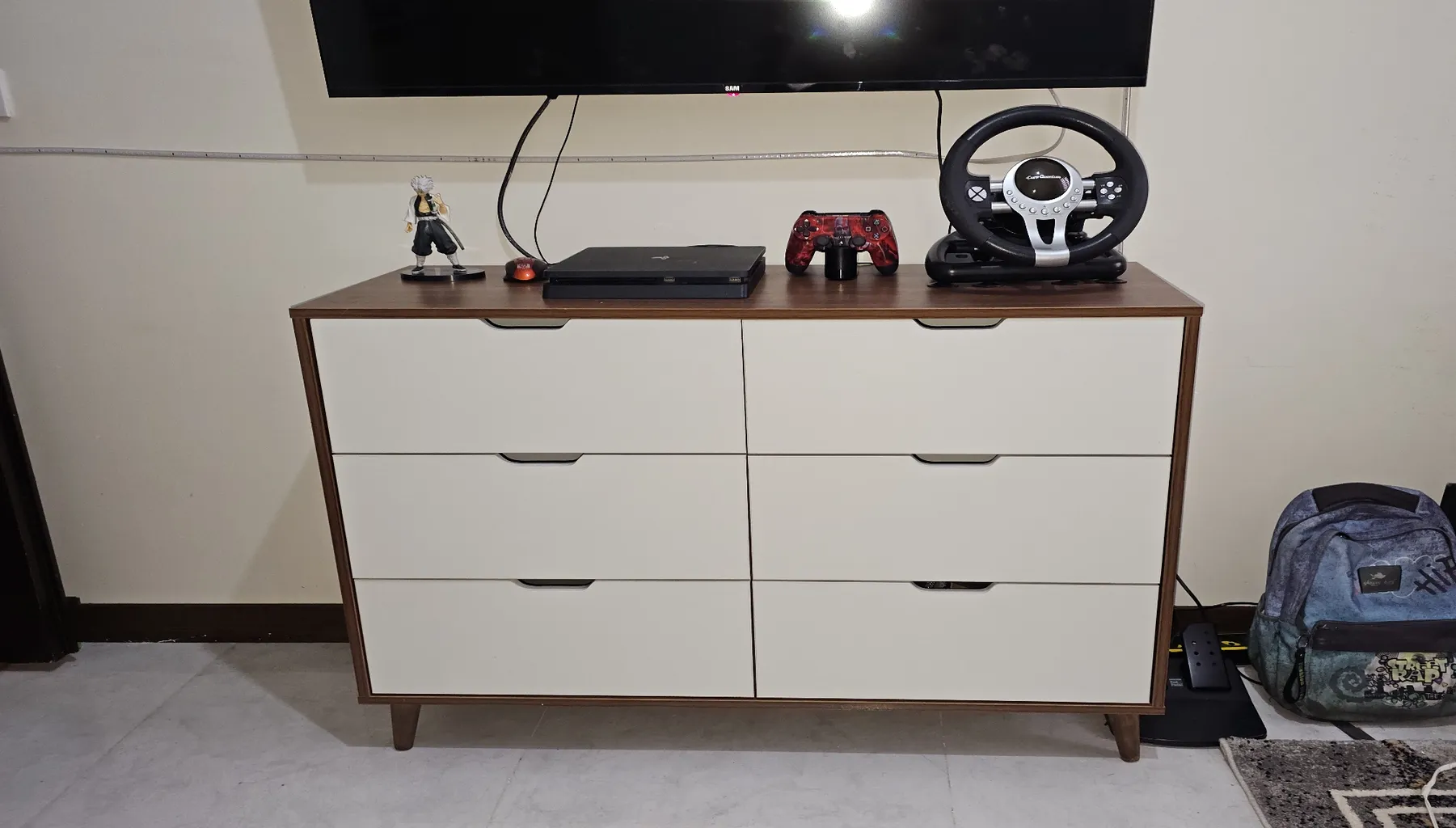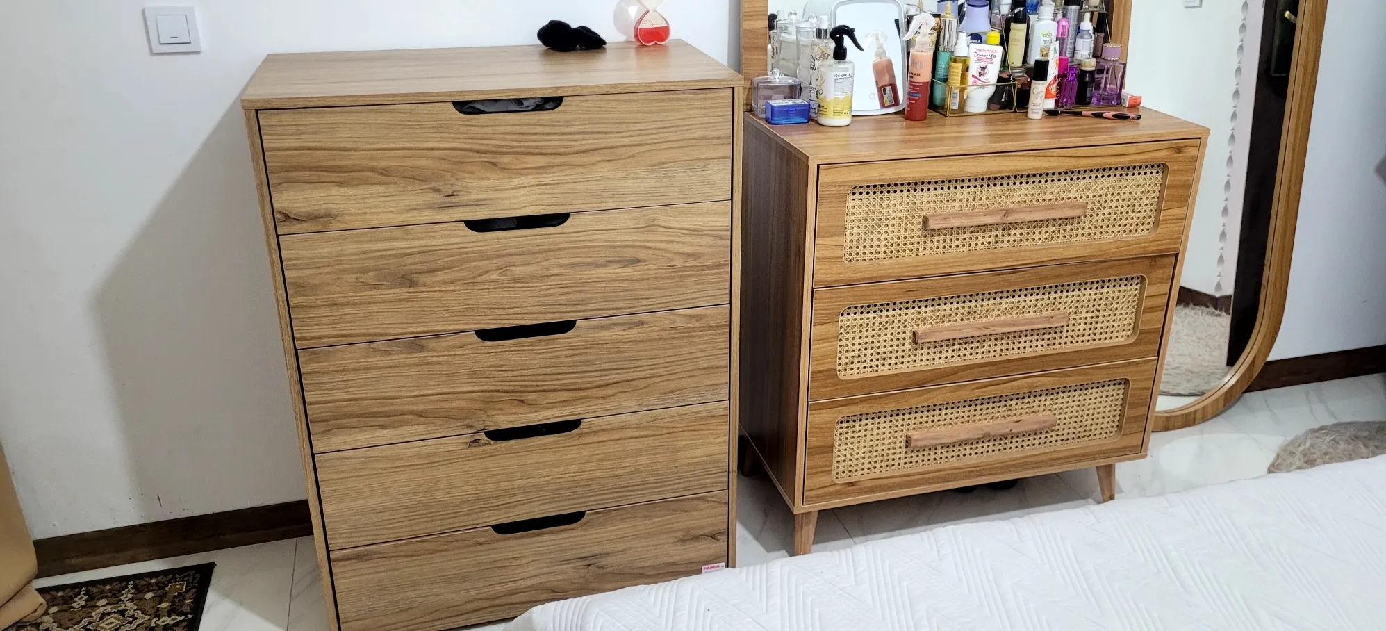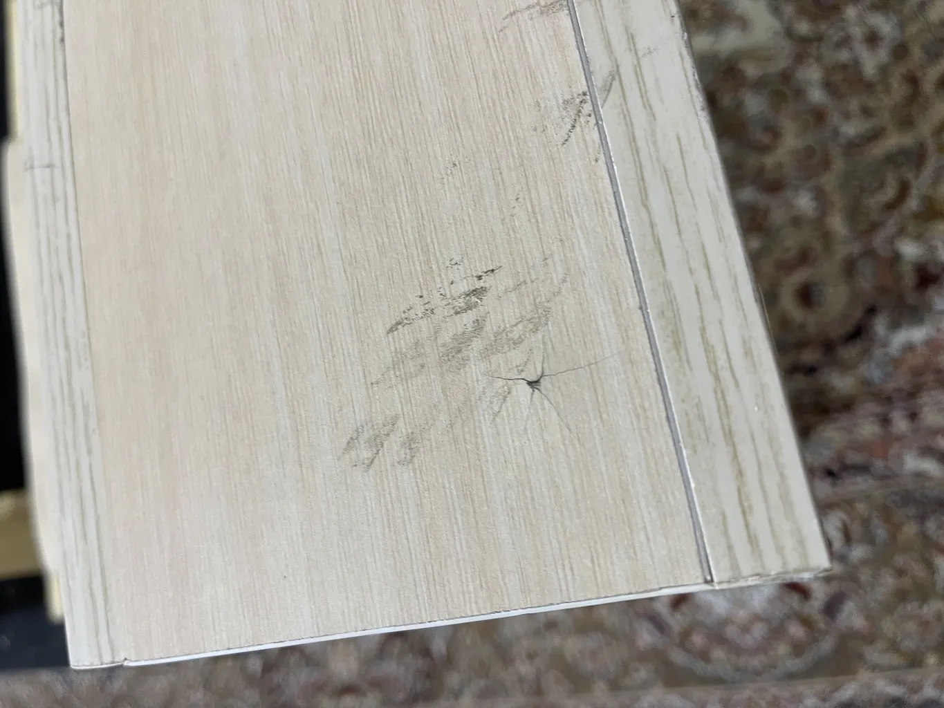 اما فروشنده اصلا تمیز کار نکرده بود اول اینکه قسمت داخلی دراور ترک داشت اما چون به سختی میشه دید مرجوع نکردم دوم اینکه اصلا با ظرافت کار نشده بود کشو ها کمی کج هستند برخی قسمت ها چسبش بیرون ریخته بود با این حال باز کردن کشو ها که بصورت فشاری هست کار میکنه اما من ترجیح میدم ازش استفاده نکنم چون خیلی صدا میده مورد سوم اینکه کلی جای ماژیک داشت که به سختی پاکشون کردم