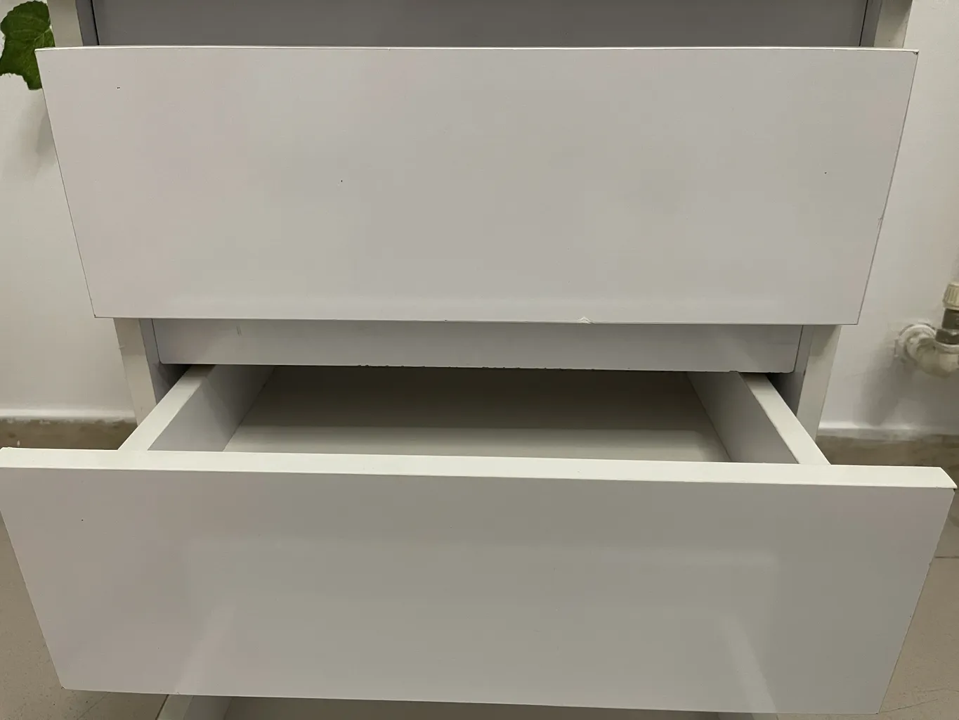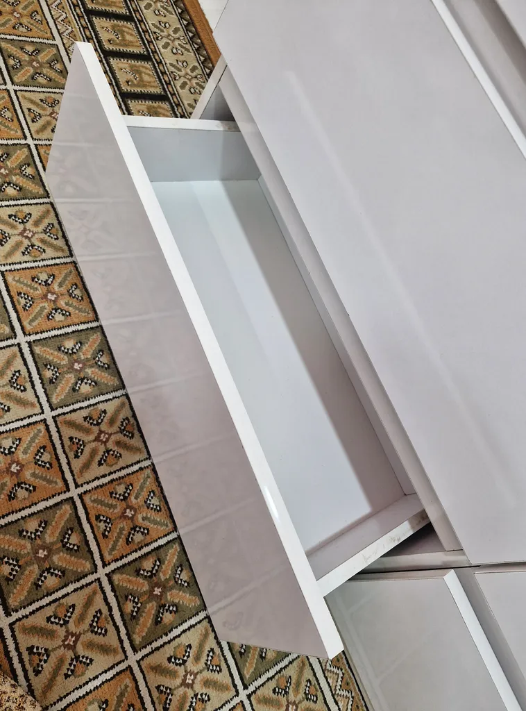 از خود دراور بگم فوق العاده تمیز بدون 1 لکه.. تراز و همه جای دراور از ورق های سفید استفاده شده البته غیر از پایه ها که رنگ گردویی هستش و زیبایی دراور رو چند برابر میکنه..