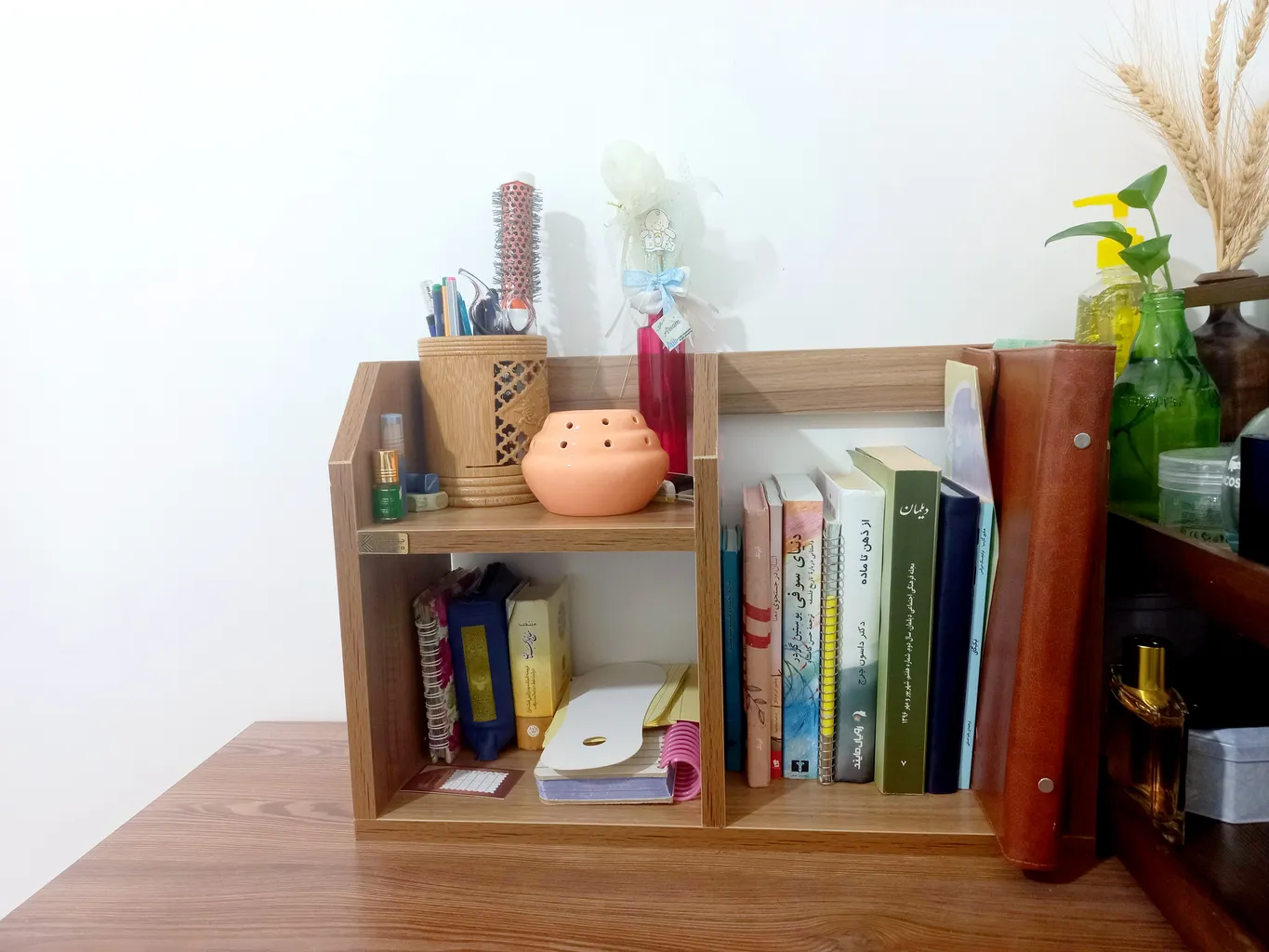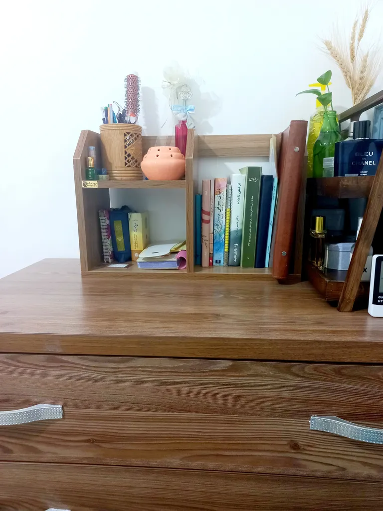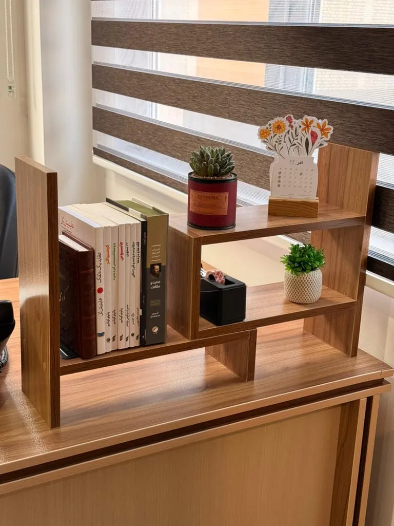 - ⬤ کتابخانه رومیزی : این نوع کتابخانهها معمولاً برای قرار دادن روی میز یا قفسههای دیگر طراحی شدهاند و به عنوان دکوری نیز استفاده میشوند. خریداران از کاربردی بودن و طراحی زیبا این کتابخانهها راضی هستند و به قابلیت جابجایی آسان آنها اشاره میکنند. اما برخی از خریداران به کمبود فضای کافی برای نگهداری کتابهای بزرگ و عدم استحکام کافی در برخی مدلها انتقاد کردهاند.