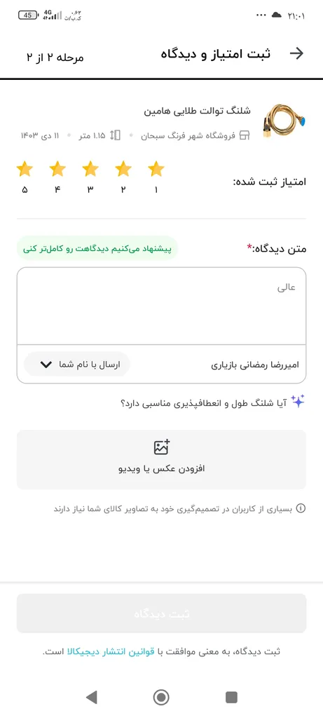- ⬤ قیمت : قیمت مناسب نسبت به کیفیت، یکی از عوامل مهم در انتخاب شلنگ است. خریداران به دنبال شلنگهایی با قیمت معقول و کیفیت بالا هستند و این نکته در نظرات آنها به وضوح دیده میشود.