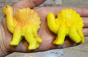 جنس پوسته گچ هستش که رنگ شده، توش فیل و گوریل بود جنس سیلیکونی و نرم ، بچه ها خیلی ذوق میکنن از دیدن حیوونای تو تخم