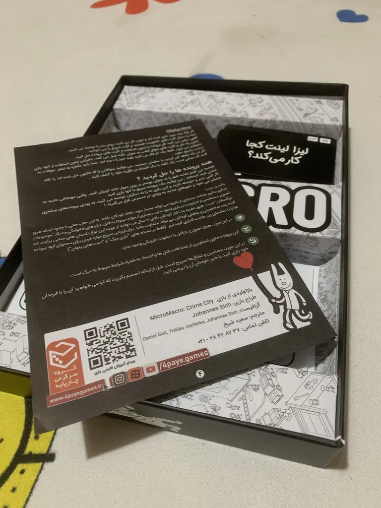محمدصالح رزاززاده : بازی فکری Micro Macro ؛ بازی فکری میکرو ماکرو یه بازی 1 تا 4 نفره هسته که قوانین خیلی ساده ای داره ولی واقعا گیم پلی درگیر کننده ای داره. توی هر دور از بازی یکی از 16 پرونده بازی رو انتخاب میکنین و با استفاده از کارت هایی که توی پرونده هسته بازی رو شروع میکنید، روی هر کارت دو طرف وجود داره، یه طرف سوال رو پرسیده و طرف دیگه جواب سوال رو گفته. توی بازی بازیکن ها باید تلاش کنن با توجه به سوالی که روی کارت نوشته توی نشقه بگردن و جواب سوال رو پیدا کنن بعد از این که فکر کردن جواب سوال رو پیدا کردن کارت رو برمیگردونن و جواب رو نگاه میکنن که آیا درست گفتن یا نه اگر درست گفته باشن میرن سراغ سوال بعدی از همون پرونه ولی اگر اشتباه گفته باشن باید دوباه برگردن تا جواب رو پیدا کنن. شدیدا گیم پلی بازی فکری و جذاب هسته و تک نفره خیلی خوبی داره. و نکته جالب دیگه ای هم که این بازی داره اینکه این بازی برنده بهترین بازی سال 2021 شده که خودش نشوندهنده اینه که واقعا عرضش داره خرید این بازی
