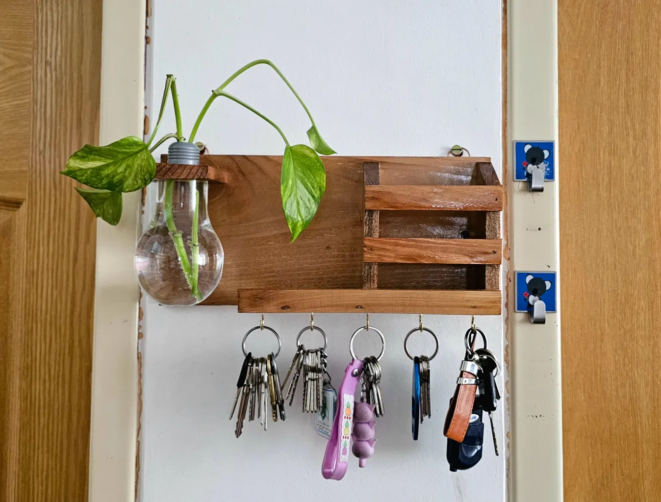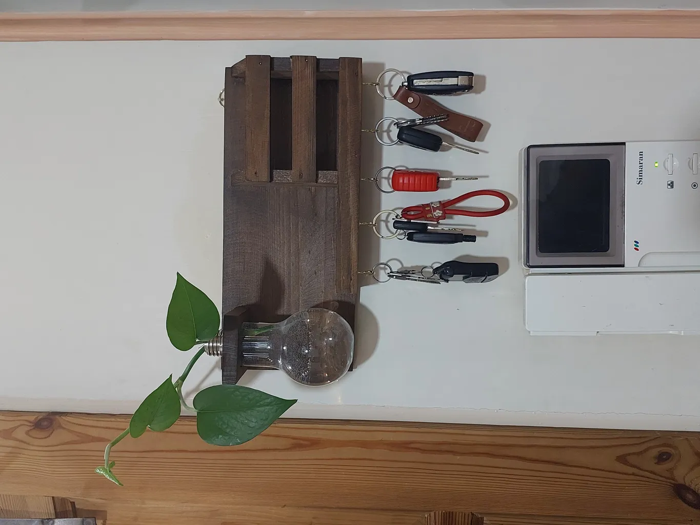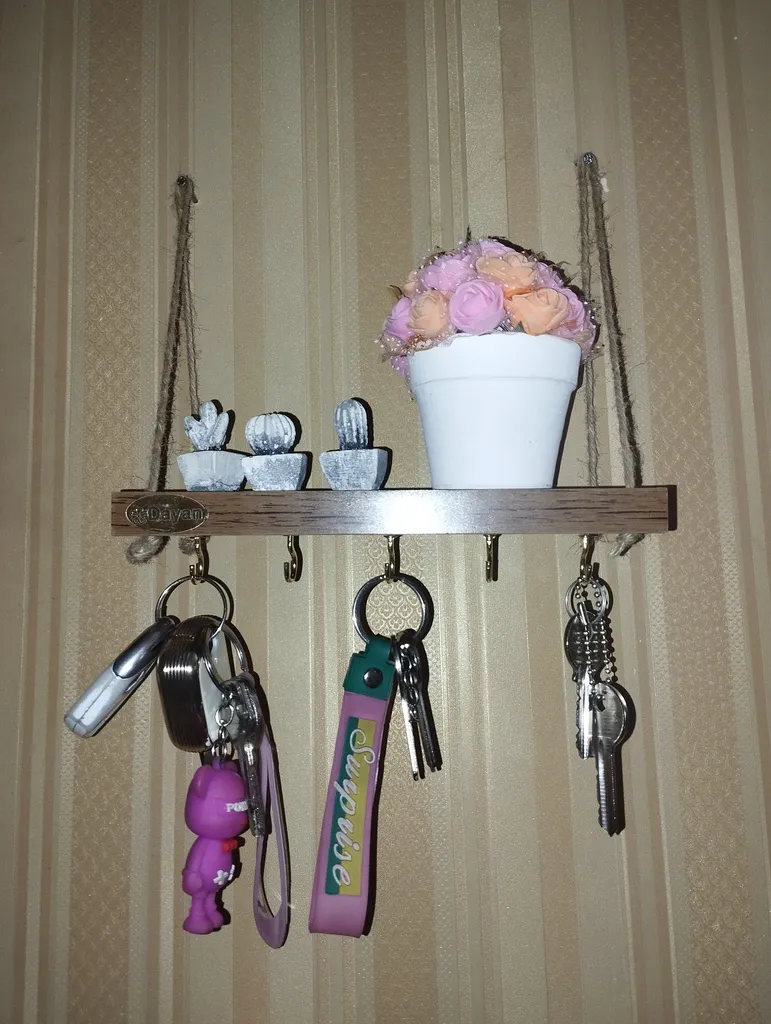این جاکلیدی بنظرم طراحی خیلی جالبی داره و جالبتر اینکه میشه شخصی سازیش کرد.مثلا میتونیم تو گلدونش گیاه دلخواه مون رو قرار بدیم.رو قسمت وسطی هم میشه قاب عکس، مجسمه کوچیک و... گذاشت.ضمنا علاوه بر اینکه چهار تا آویز کلید داره، یه قسمتی هم هست که میشه توش کارت بانکی، جا کارتی، کیف مدارک و... گذاشت. خریدش رو توصیه میکنم فقط تو انتخاب فروشنده دقت کنید.اینی که عکسش رو گذاشتم که به دیوار زدیم جاکلیدی گالری بیس سیب هست