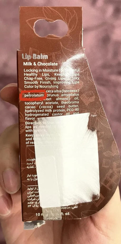 توی این بالم لب، ماده پترولاتوم استفاده شده که با یک سرچ میتونین مضرات این ماده رو پیدا کنین. جزو مواد سرطان زا هست و در بسیاری کشورها استفاده ازش در محصولات آرایشی بهداشتی ممنوعه